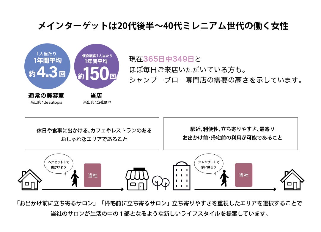 出勤前やお出かけ前にサロンで出かける準備をする、仕事帰りにシャンプーをして帰るという習慣、仕事やプライ ベートで毎⽇忙しい多くの⼤⼈⼥⼦たちのサードプレイスサロンとして、⼼⾝の健康を担っています。