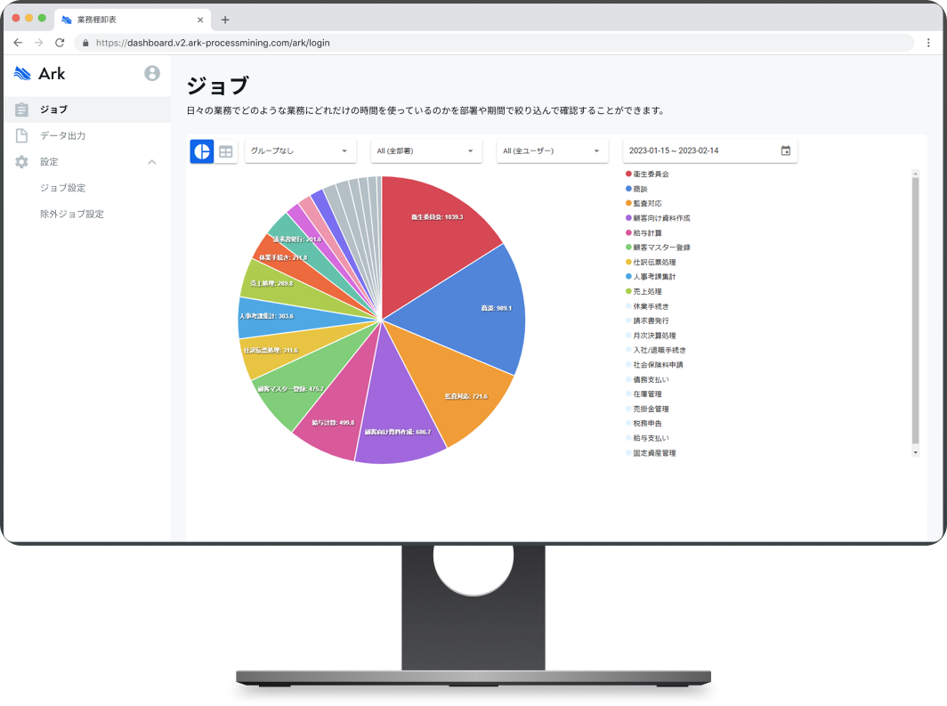 業務可視化・プロセスマイニングツールの多くは、データの手入力の必要性や、特定のソフトウェアからのデータ取得のみが可能です。一方で業務改革クラウドは、PCでの業務データを取得し、すべての業務データを可視化できます。