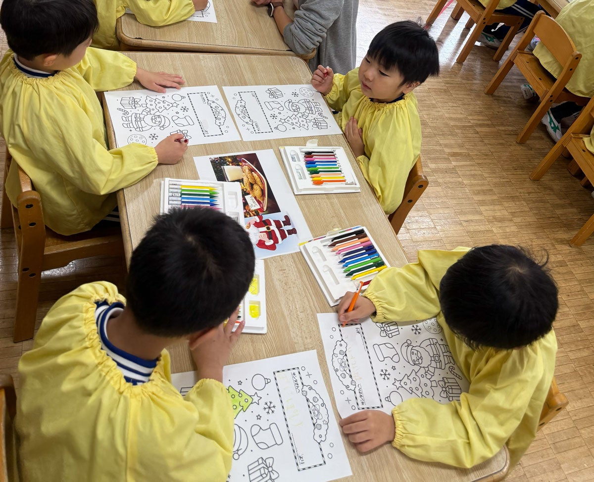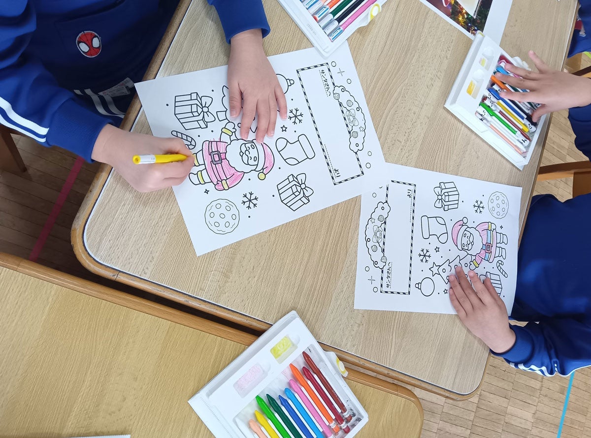 サンタさんへの感謝の気持ちを込めたメッセージカードづくりを実施。塗り絵をしながら、