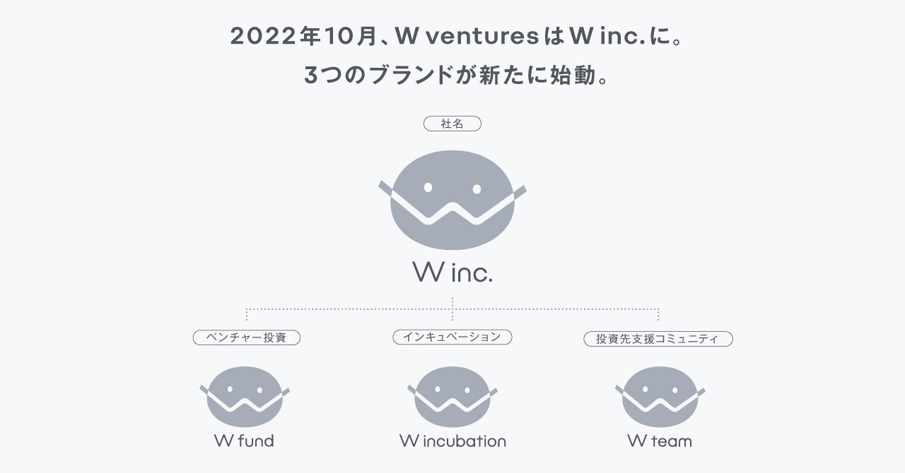 W ventures株式会社(本社:東京都渋谷区、代表パートナー:新和博 / 東明宏)は、2022年10月より社名を「W株式会社(以下、W inc.)」に変更し、「W fund(ベンチャー投資)」「W incubation(インキュベーション)」「W team(投資先支援コミュニティ)」の3ブランド体制になることをお知らせいたします。