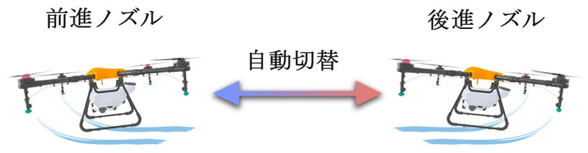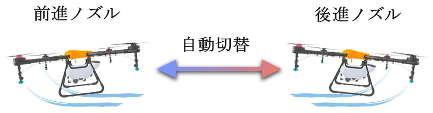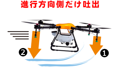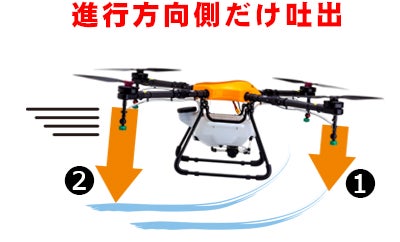 「飛助MG/DX」の大きな特長は、軽量な機体にもかかわらず無人ヘリに劣らない優れた散布性能を備えることです。この度、4枚プロペラと吐出ノズル前後切替装置を組み合わせた散布構造が特許を取得しました。30インチの大きな4枚プロペラが生み出す強いダウンウォッシュと、渦の影響を受けにくくする前後切替装置を組み合わせた飛助MG/DXの散布システムは、ご使用される皆様に安定したトップクラスの散布品質をご提供することが可能です。
