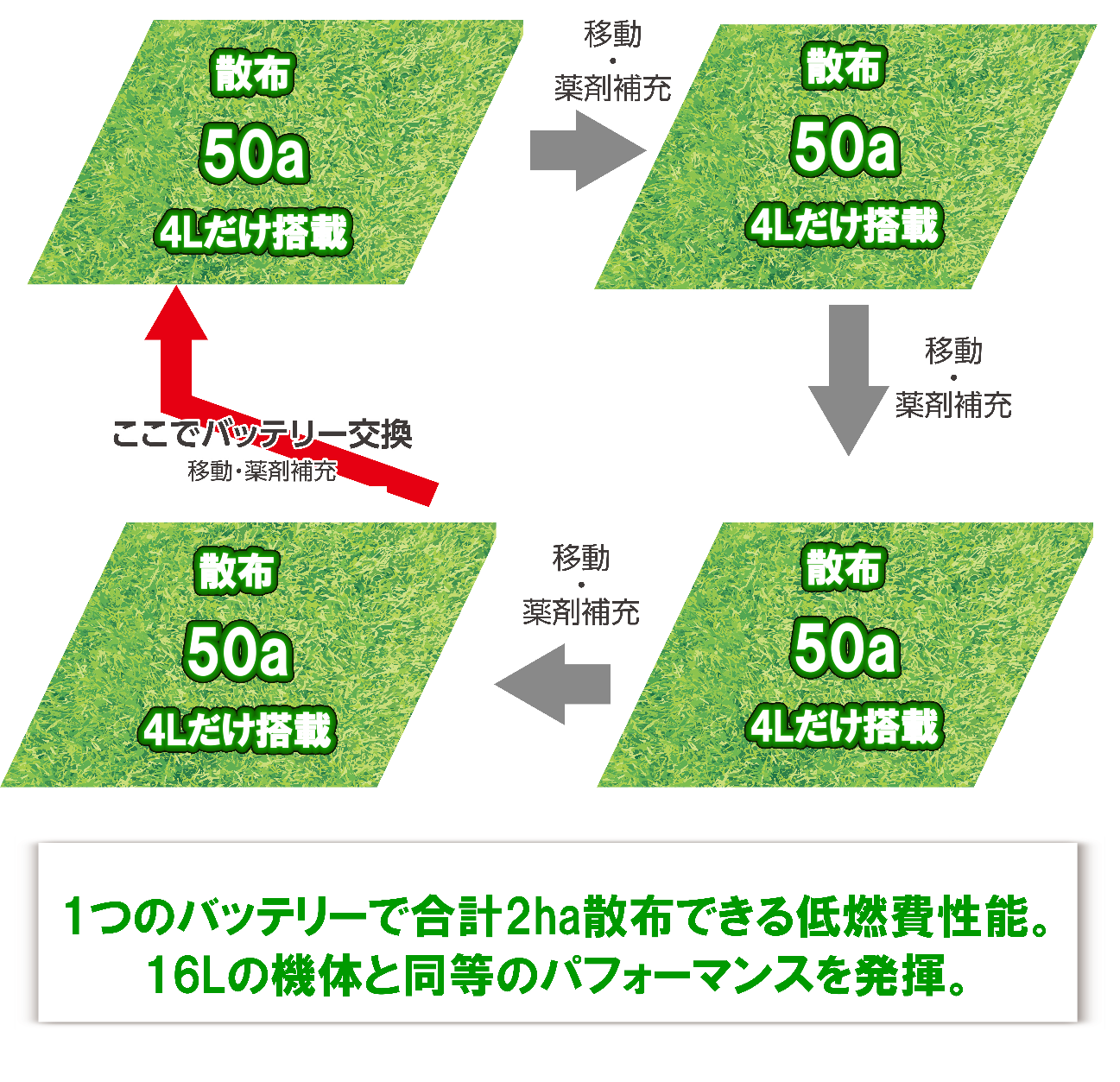 国内の圃場の多くは1箇所あたり50a以下の圃場が多く存在します。そのようなところで、効率的に運用するためにはバッテリーの飛行時間が問題でした。