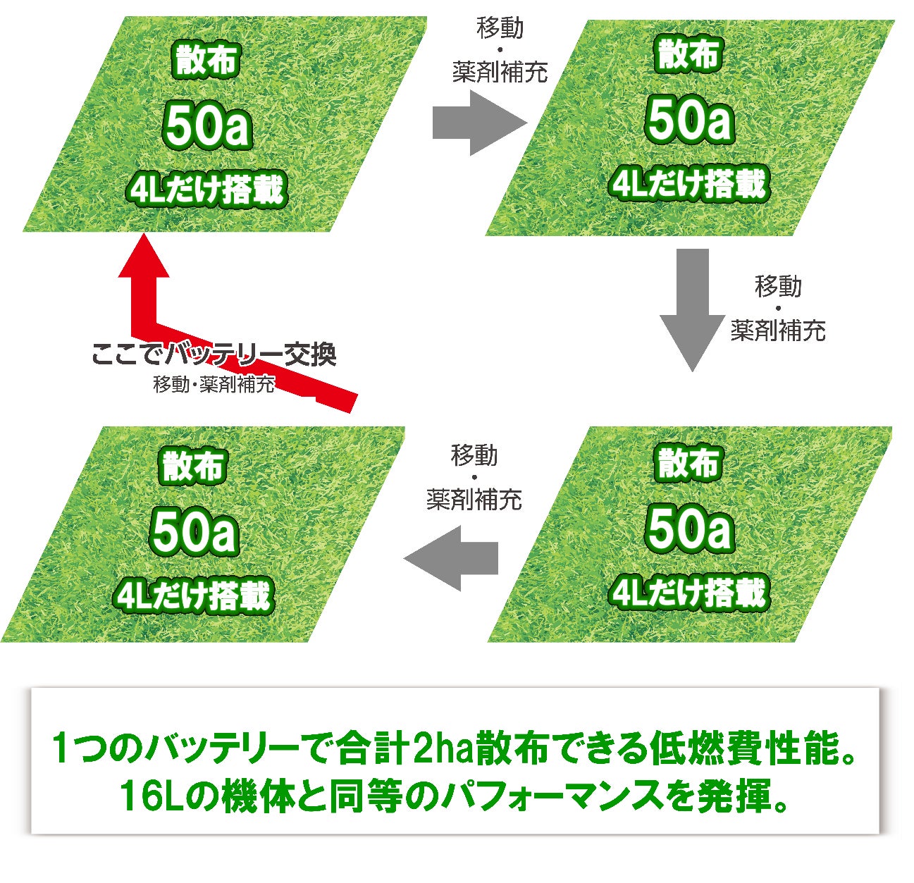 - 10L容量でも、一つのバッテリーで最大2haの散布能力