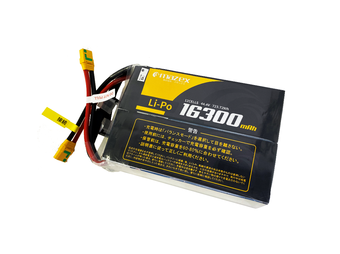 そこで国内で最も使用される圃場面積を基本にバッテリーの容量や成分に設定して、㈱マゼックスオリジナルバッテリーを搭載します。またモーターとESCを変更して飛行電力消費量を削減し、飛行時間が大幅に向上しました。