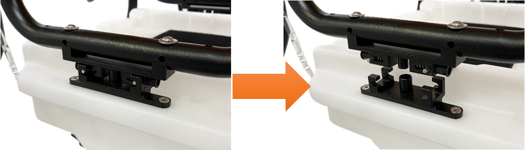 液剤散布装置と粒剤散布装置を容易に変更できるように、プロペラの固定金具として実績のある機構でワンプッシュ式に変更しました。つまみを押すだけで散布装置は強固に固定できます。