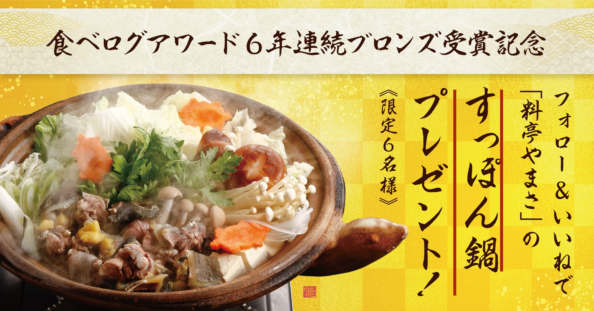 創業約100年の老舗すっぽん料亭である「料亭やまさ」が、食べログアワード6年連続「ブロンズ」受賞を記念して、Instagramにてプレゼントキャンペーンを実施します。