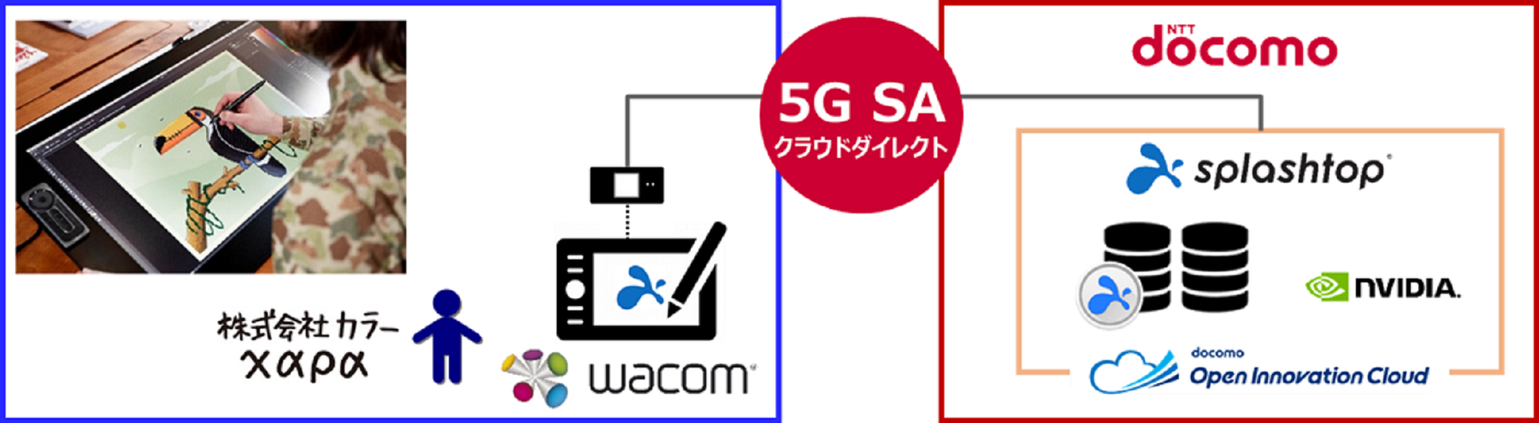 カラーのクリエーターがワコムの液晶ペンタブレットを操作。デジタルペンの入力信号を5G SAを 用いたモバイル閉域通信で、ドコモオープンイノベーションクラウド内にあるスプラッシュトップのエッジサーバーに接続。高性能GPUで高速演算処理を行い、リモートデジタル作画を実現する。