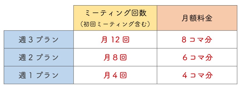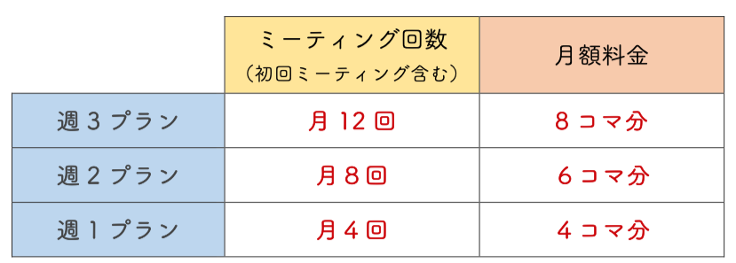 「Home School+」は、担当講師と月に何回オンラインミーティングを実施するか(担当講師と会う回数)によって、プランが決まります。(週1プランだと、月4回 ミーティングを実施することになります)