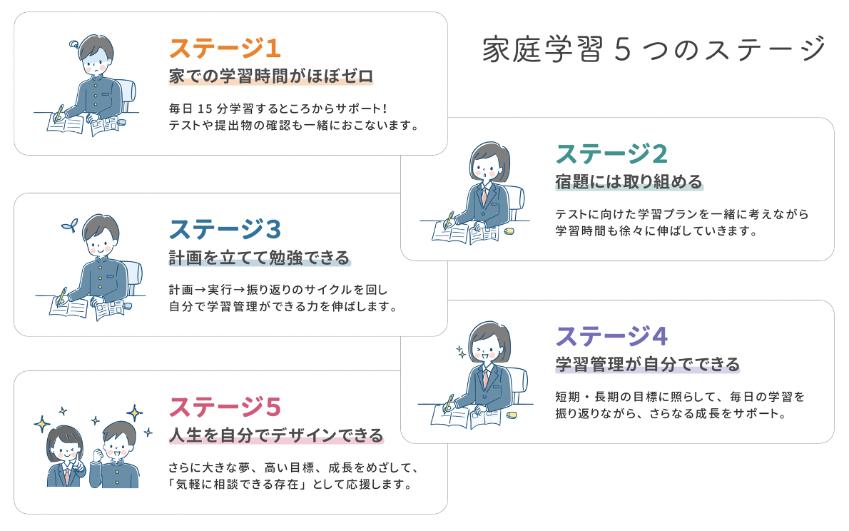Home School+では「家庭学習5つのステージ」をもとに、生徒の自習力の成長をサポートします。