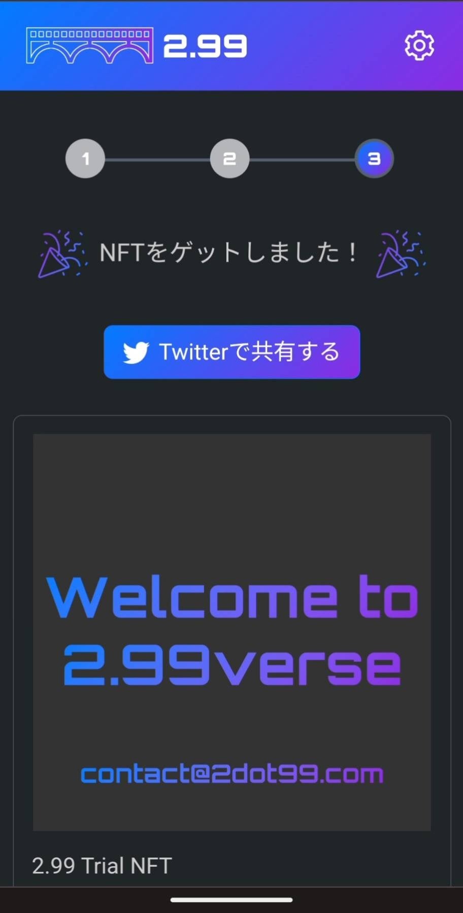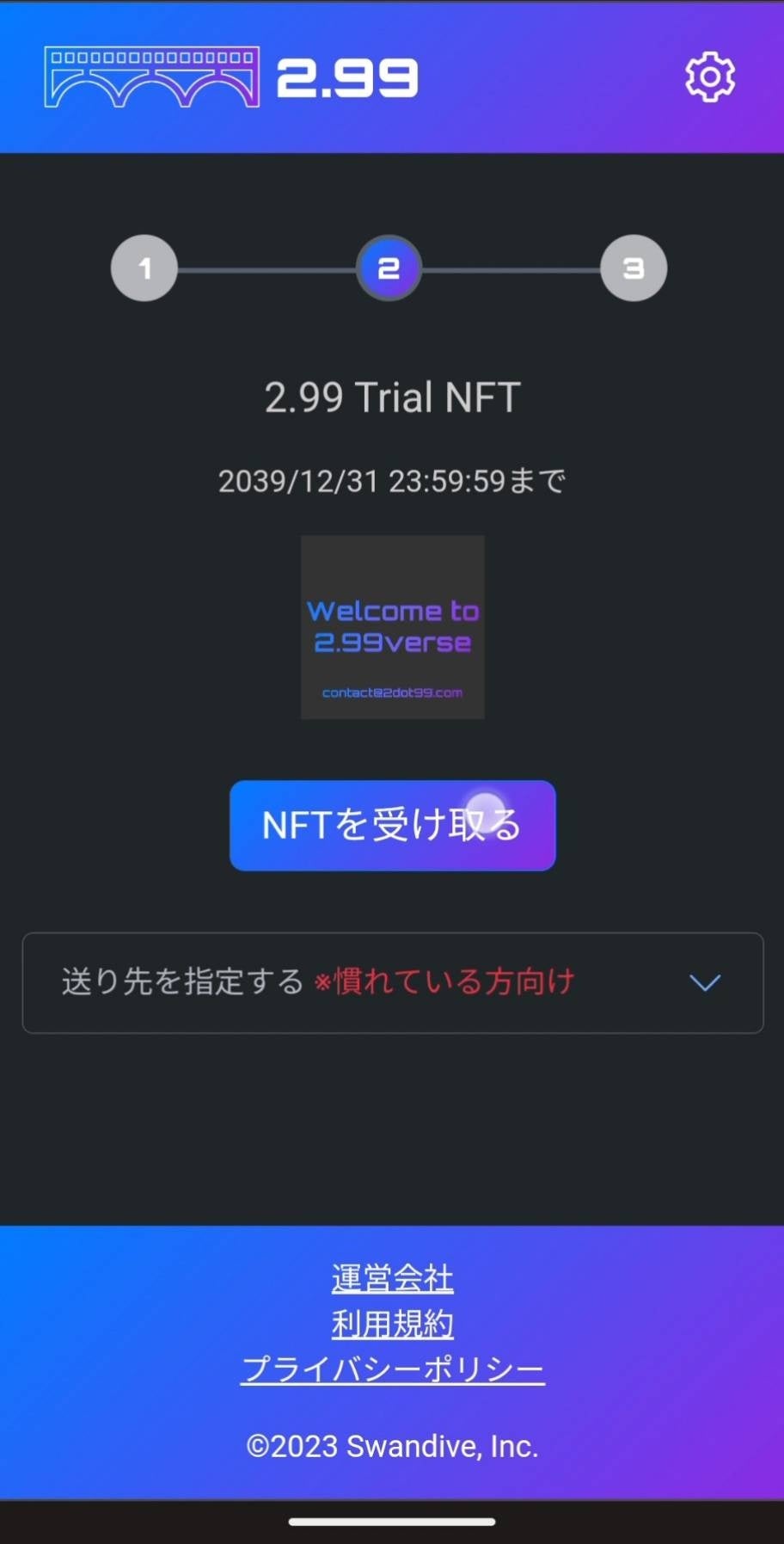 また、2023年12月31日まで「2.99」のローンチを記念したNFTを配布しております。「2.99」を体験していただく機会でもありますので、ご興味をお持ちになりましたら是非下記URLにアクセスしてお試しくださいませ。