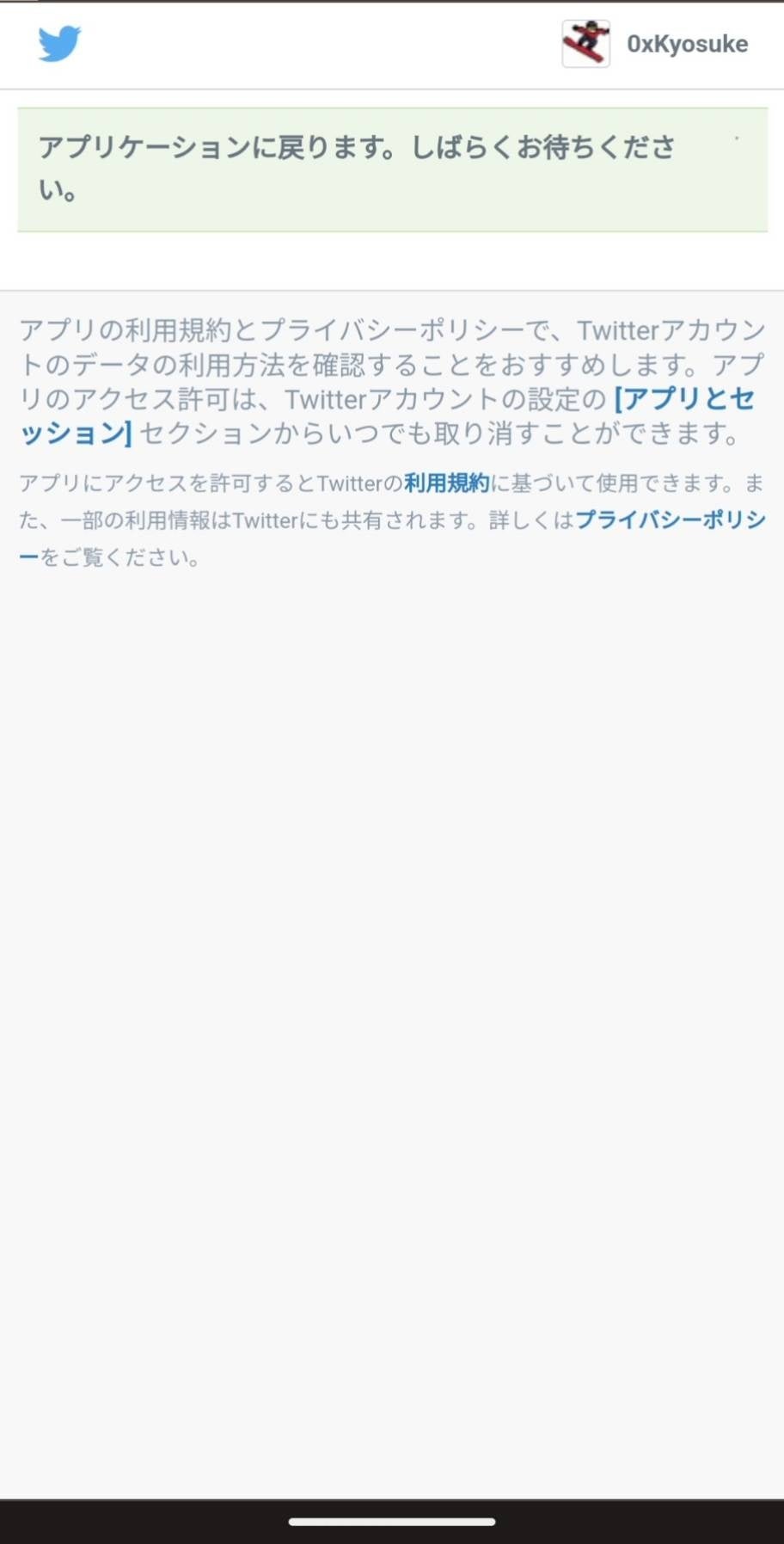 Twitterの認証画面に遷移して、Twitterのユーザー名とパスワードを使ってログインをします。