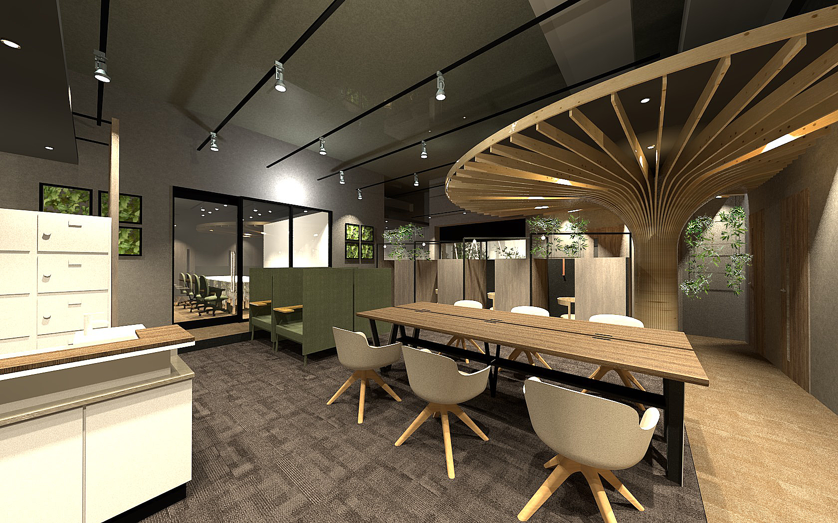 シンボルツリーをメインに緑がワークスペースのあらゆる所に。一番のおすすめは窓越しに緑を眺められるリラックススペース。ゆったり座れる椅子にもたれながら眺める緑は贅沢な時間を過ごせること間違いありません。