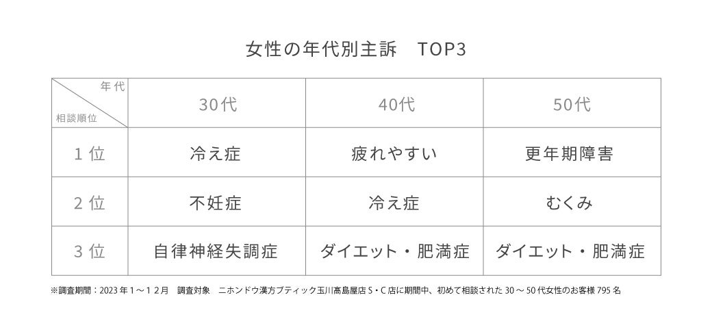 玉川髙島屋S・C店に来店されるお客様は30代~50代の女性が多く、冷えや疲れやすさなどの不調のほか、ダイエットなどの体型に関するお悩みも多く寄せられます。漢方では、女性の体調は7年周期で変化するといわれています。ご相談の多い30~50代はゆるやかに体調が変化していく時期であると同時に、家庭や仕事に追われ、体力の低下に反して体を酷使している“頑張りすぎ”の方が多い世代でもあります。漢方カウンセリングでは、病院に行くまでもない不調も体からのサインととらえ、一人ひとりに合った漢方薬や食生活、生活習慣をご提案します。