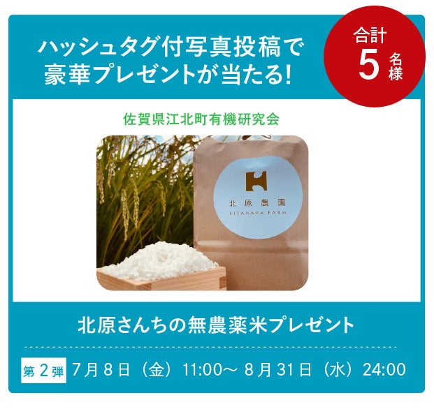 sonomono納豆菌シリーズの原料となる大豆を生産いただいている佐賀県江北町有機研究会の北原さん。「農薬や化学肥料に頼らない “素材そのもの” がいかにおいしく、体にいいのかを知って欲しい。」そんな想いで大切に育てられた、おいしい無農薬米2kgを抽選で5名様にプレゼント。