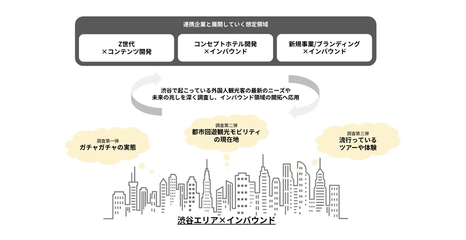 私たちはインバウンド事業への開拓を考える企業様への支援の一環として、こうした最新のインバウンドに関する調査データのレポーティングを実施しながらアーカイブし、連携企業様と共同で観光地・渋谷におけるインバウンド×Z世代向けのコンテンツや、渋谷の文化を読み解いたインバウンド向けの文化体験ツアー、インバウンド領域向けの新規事業開発やブランディングなどへ展開していくことを想定しています。