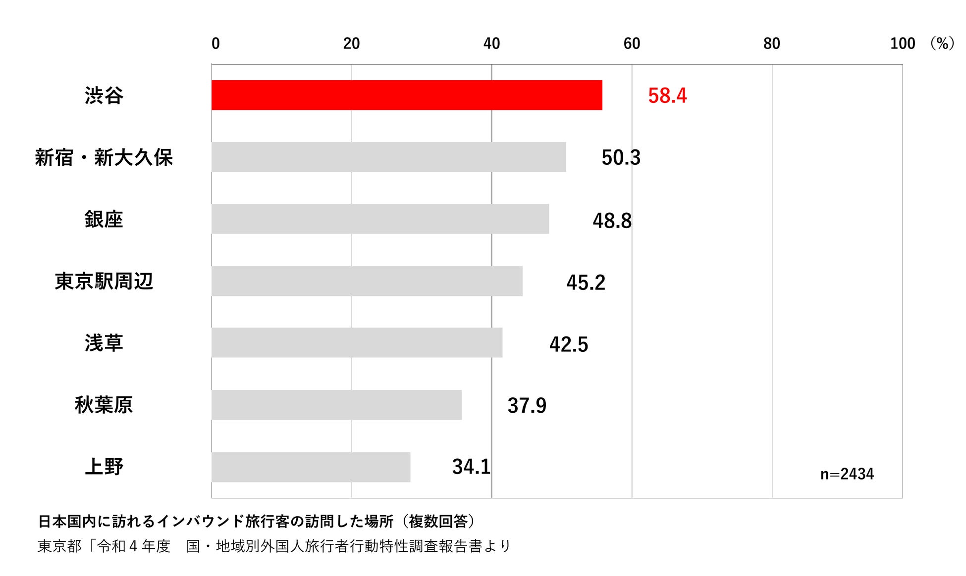 2024年6月、みずほリサーチ&テクノロジーズ株式会社は、2024年の訪日外客数が3,477万人と、2019年(3,188万人)を超えるだろうとの予測を発表しました。さらに、その旅行消費総額は7.3兆円を突破すると見込まれており、インバウンド需要への期待はますます高まっています。なかでも、渋谷は、訪れた外国人もっともが多かった場所(58.4%)となっており、訪問して「いちばん満足した場所」としてもトップの評価(10.7%)を得ています(東京都「令和4年度 国・地域別外国人旅行者行動特性調査報告書より)。