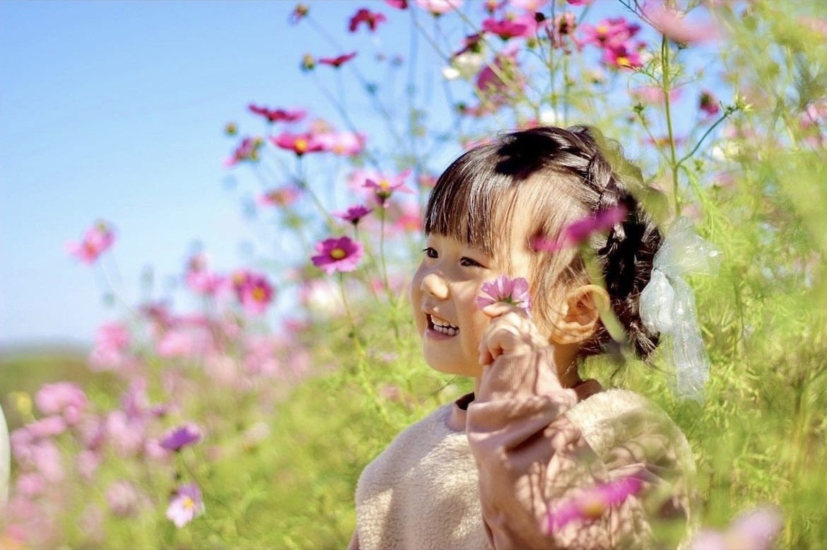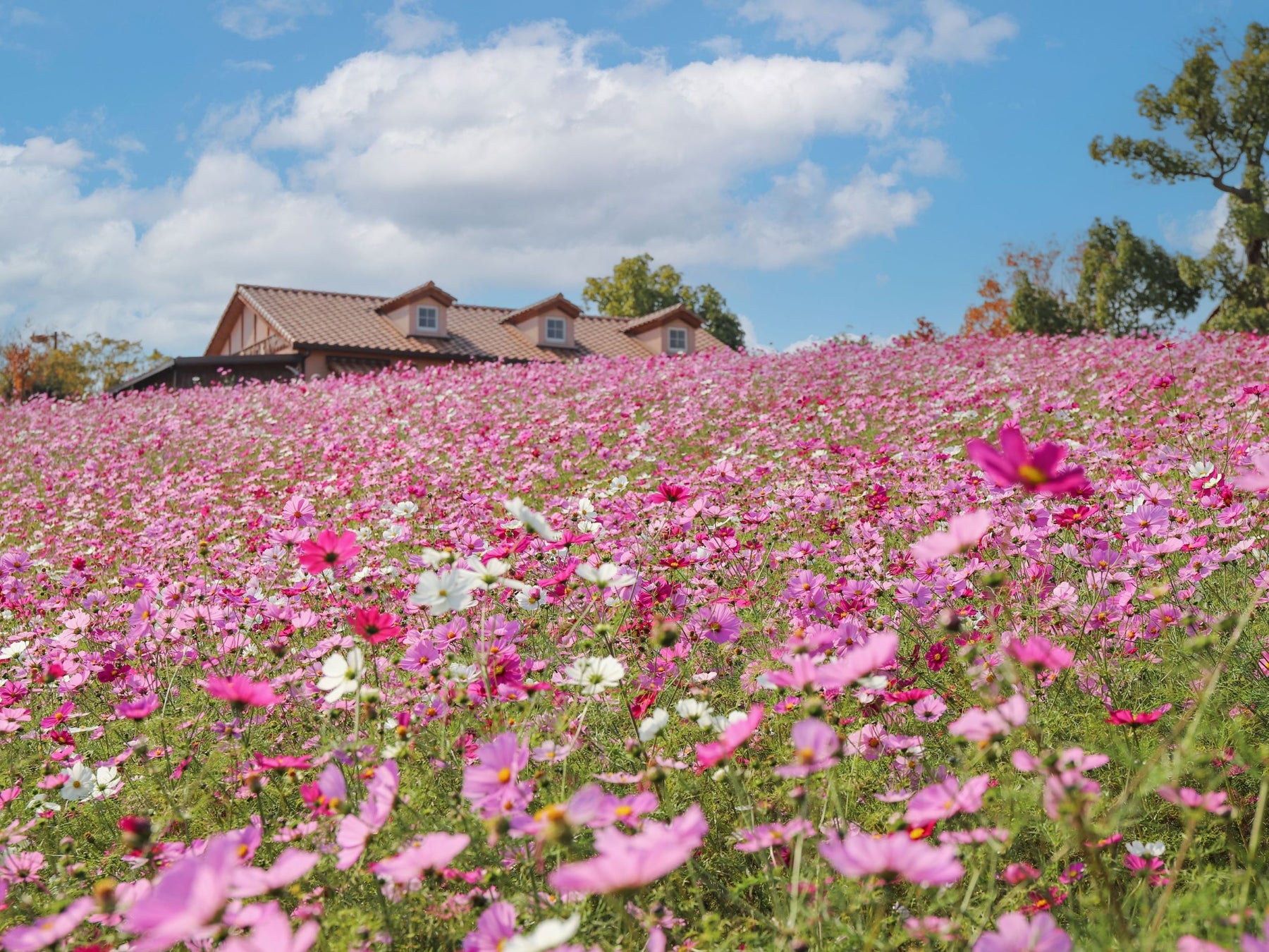 約3,000平米の花畑は傾斜になっており、花畑の中に入って撮影するとまるで背景一面がコスモスになったかのようなお写真を撮ることができます。