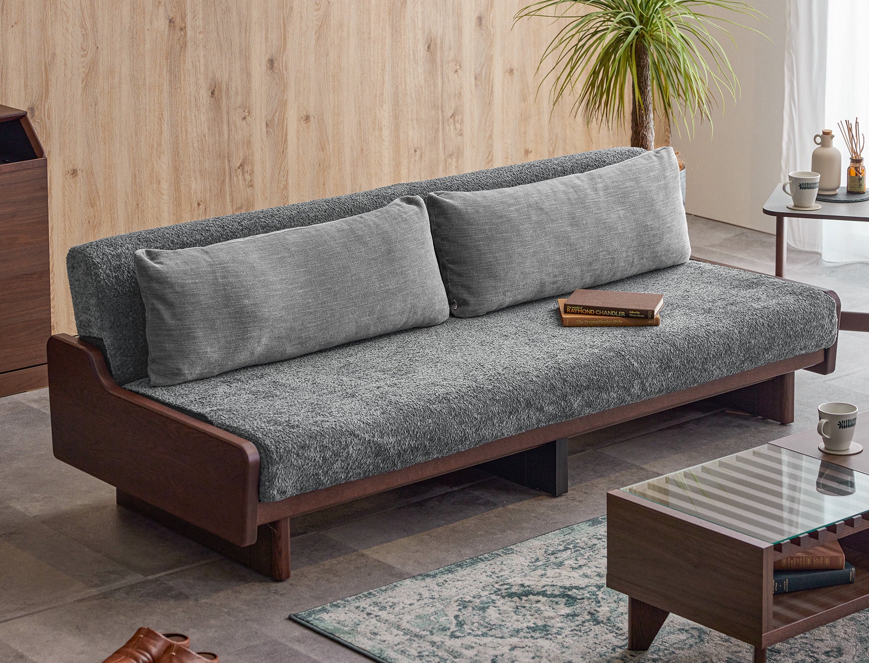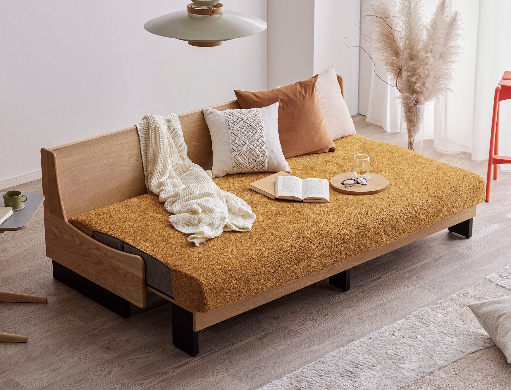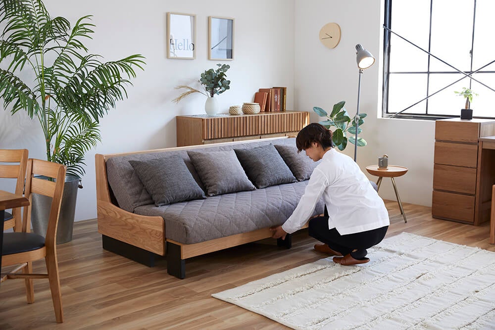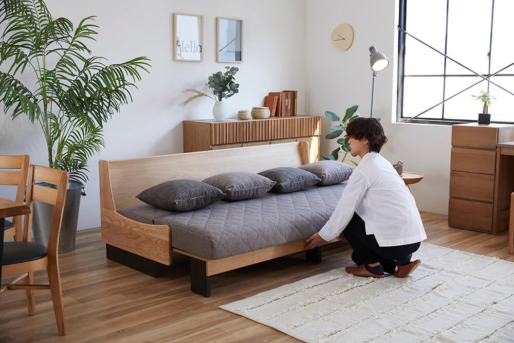 一般的なソファベッドは機械式で、壁から少し離した状態でベッド状態にしなければいけないのに対し、ごろ寝ソファは前に引き出すだけでベッドスタイルに早変わりします。