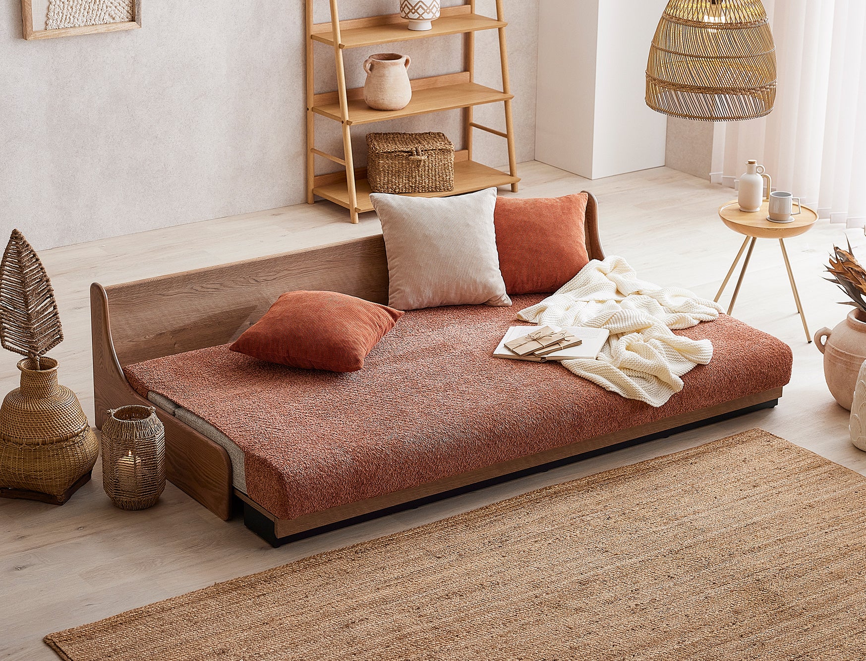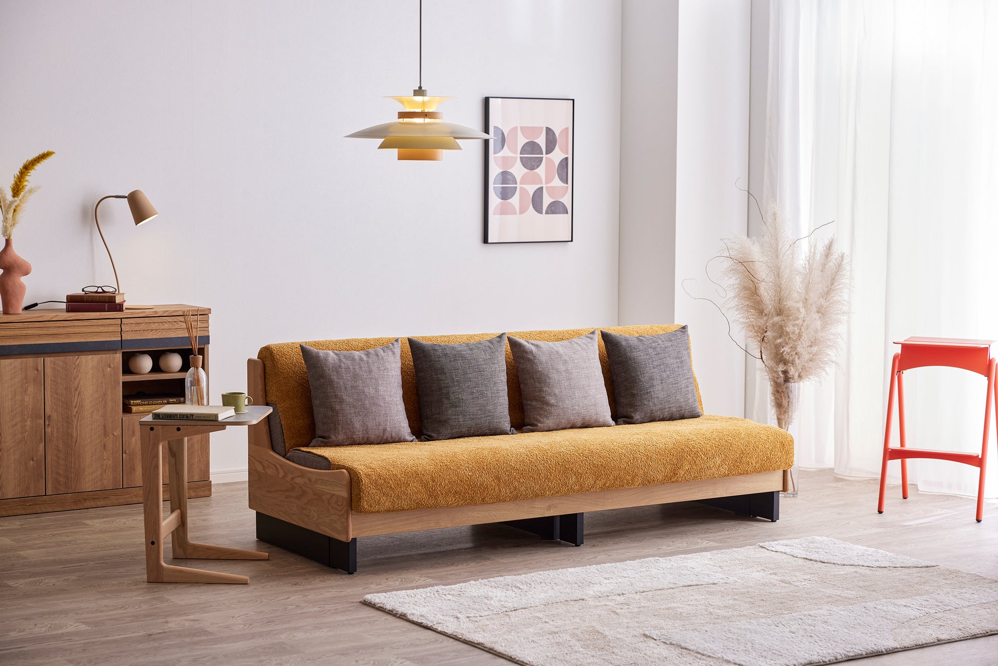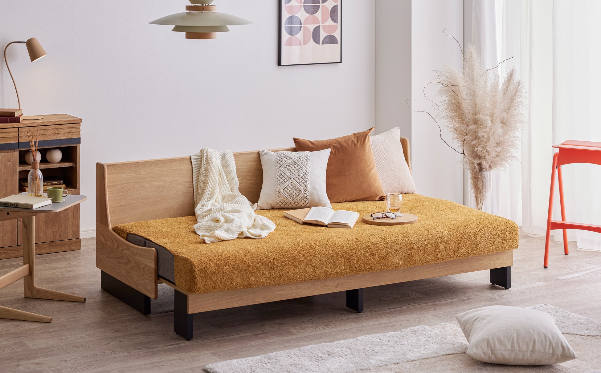 一般的なソファベッドは機械式で、壁から少し離した状態でベッド状態にしなければいけないのに対し、ごろ寝ソファは前に引き出すだけでベッドスタイルに早変わりします。