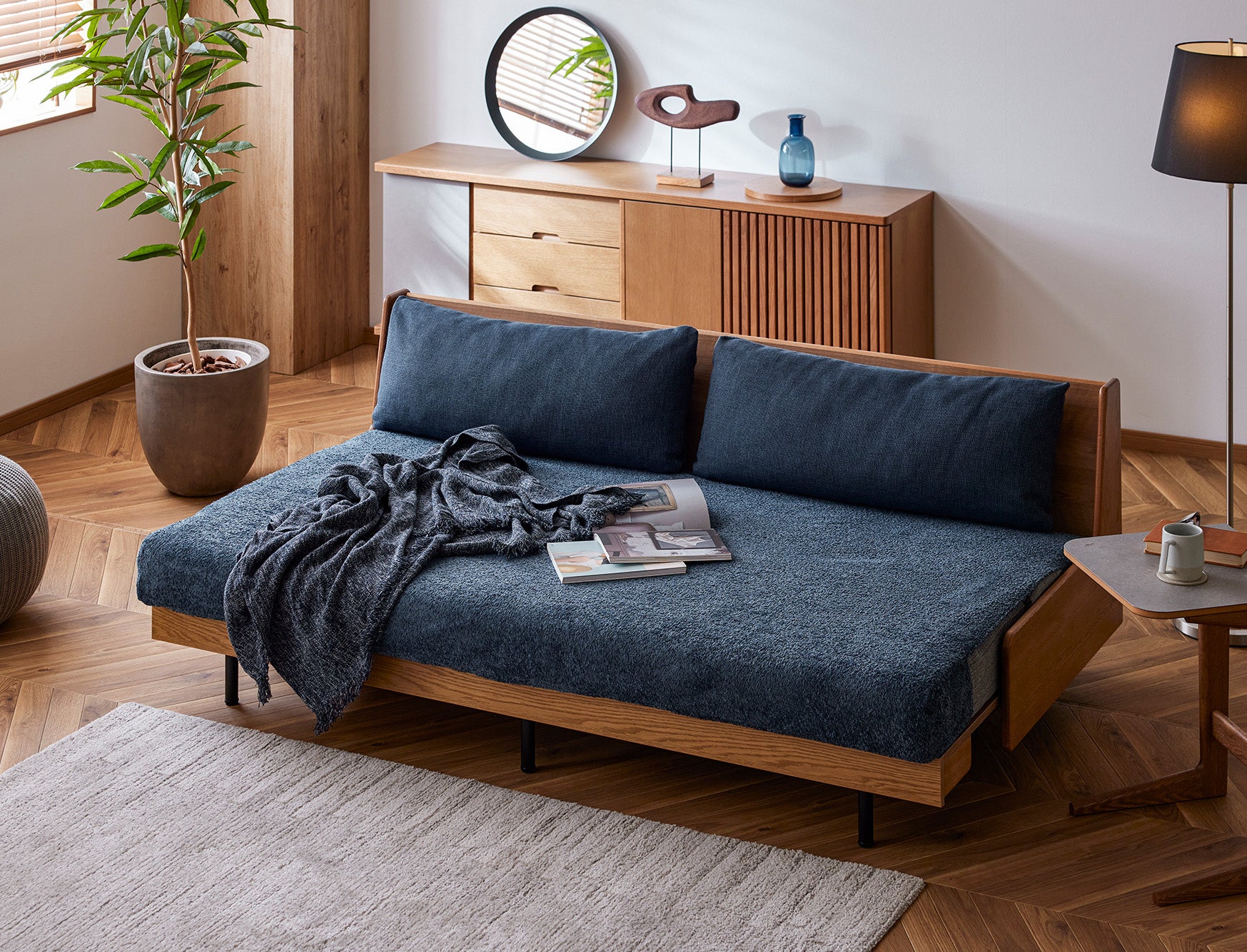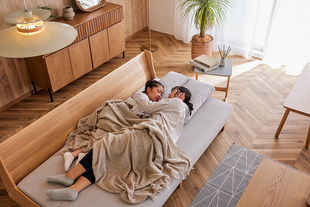 ソファの上であぐらをかいたり足を伸ばしたりするには少し窮屈でくつろぎにくいケースがほとんどです。ごろ寝ソファには、自社マットレスブランド・Literieのマットレスで採用している高反発クッション材「LITEWAVE(ライトウェーブ)」を使用しています。この素材は弾力性と通気性に優れ、寝返りもスムーズに打てるため、ベッドとしても快適な寝心地を提供します。フラットな座面なので継ぎ目も気になりません。