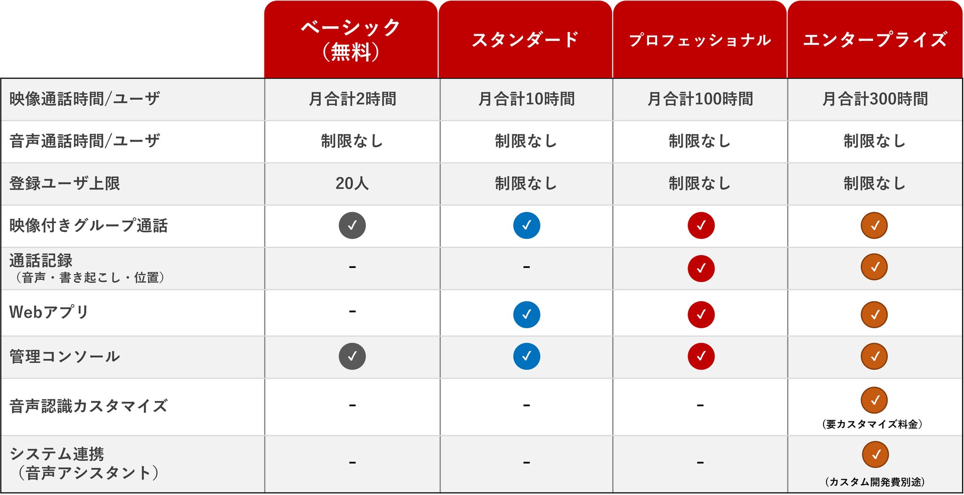 ・ベーシック :登録ユーザ数上限20名、各ユーザの映像通話月間合計2時間までを無料・スタンダード :WebブラウザからアクセスできるWebアプリが利用可能、登録ユーザ数の上限無し