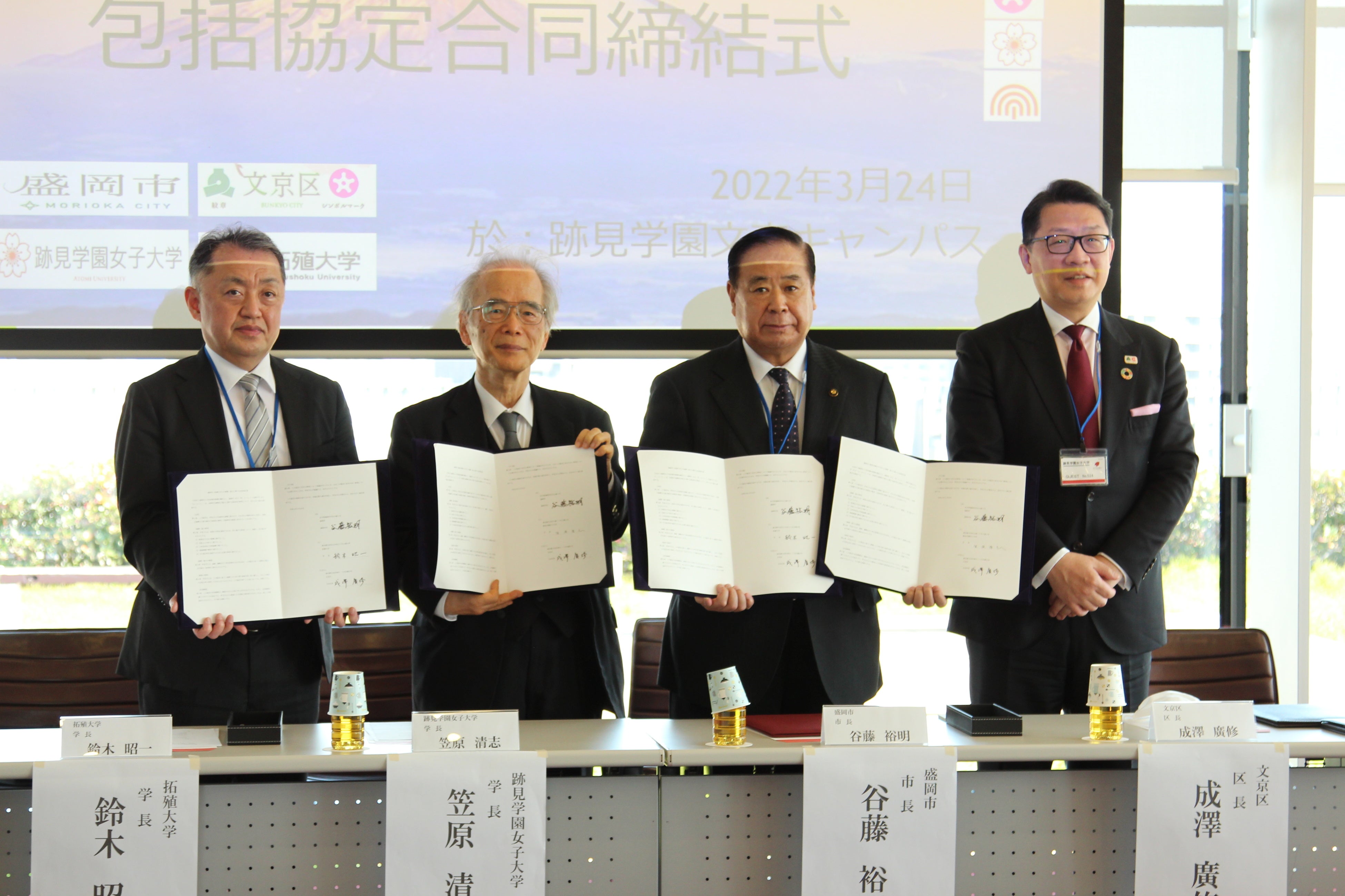跡見学園女子大学(文京キャンパス:東京都文京区大塚1-5-2/新座キャンパス:埼玉県新座市中野1-9-6)と岩手県盛岡市は「連携・協力に関する包括協定」を締結することとなり、令和4年3月24日(木)跡見学園女子大学文京キャンパスにて、締結式*を行いました(*同じく岩手県盛岡市と包括協定を締結する拓殖大学との合同開催)。