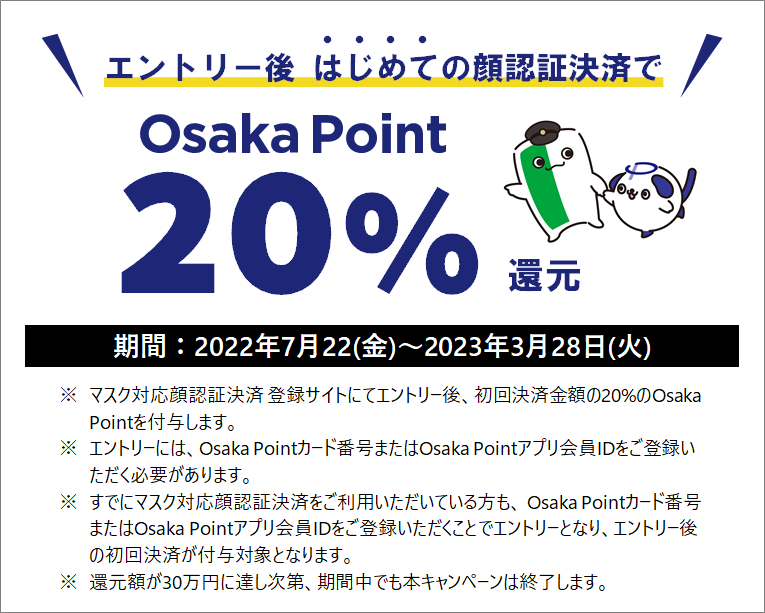 このほか、店舗ではNECの顔認証技術を採用した「マスク対応顔認証決済」にも対応し、エントリー後にはじめてご利用いただいた方には決済金額の20%のOsaka Pointを付与します。