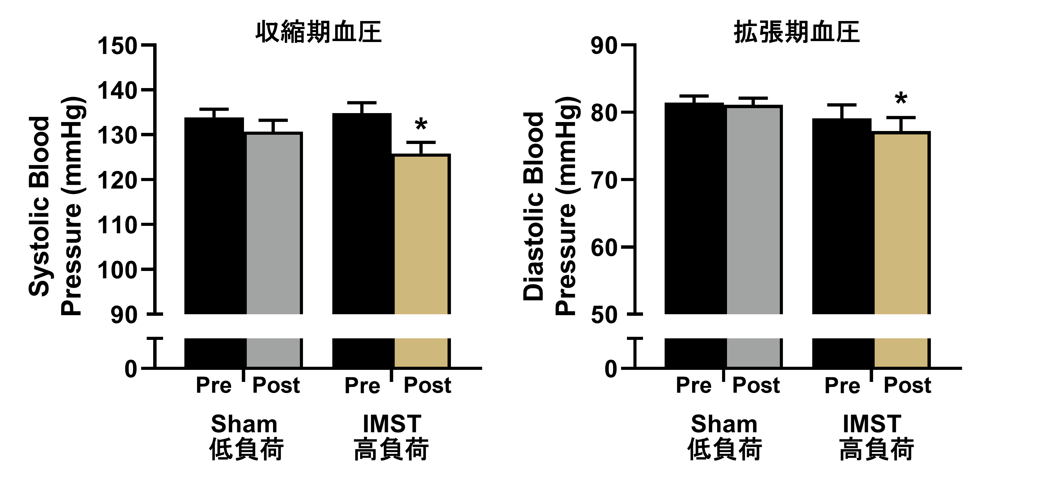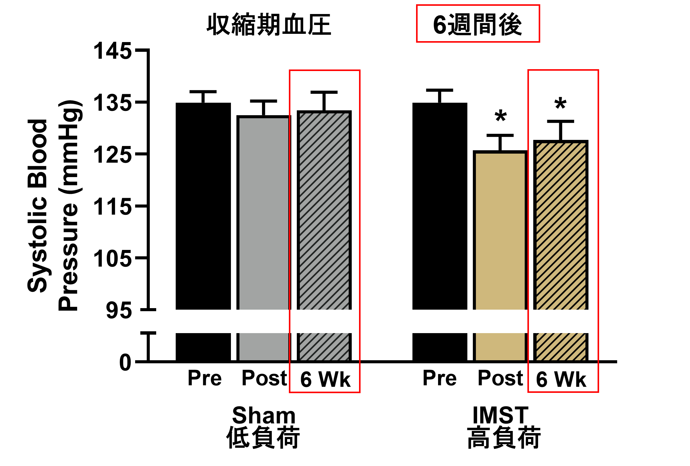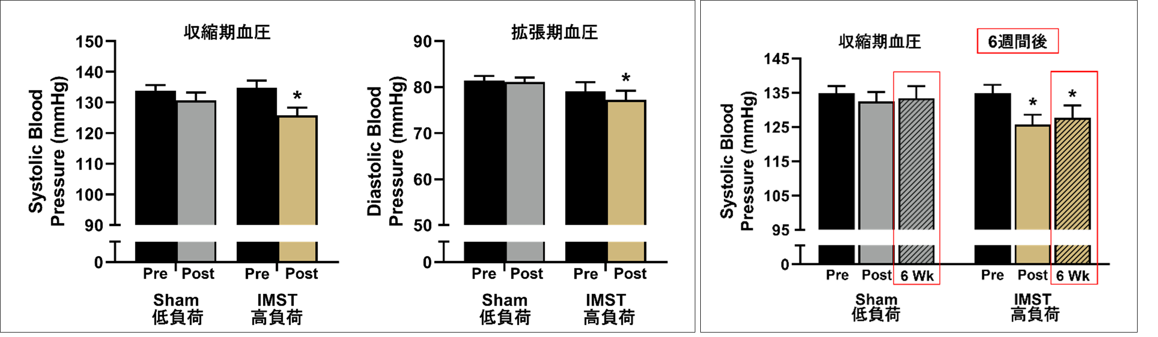収縮期血圧では、IMSTをやめた後も約6週間、血圧の低下が維持されています。