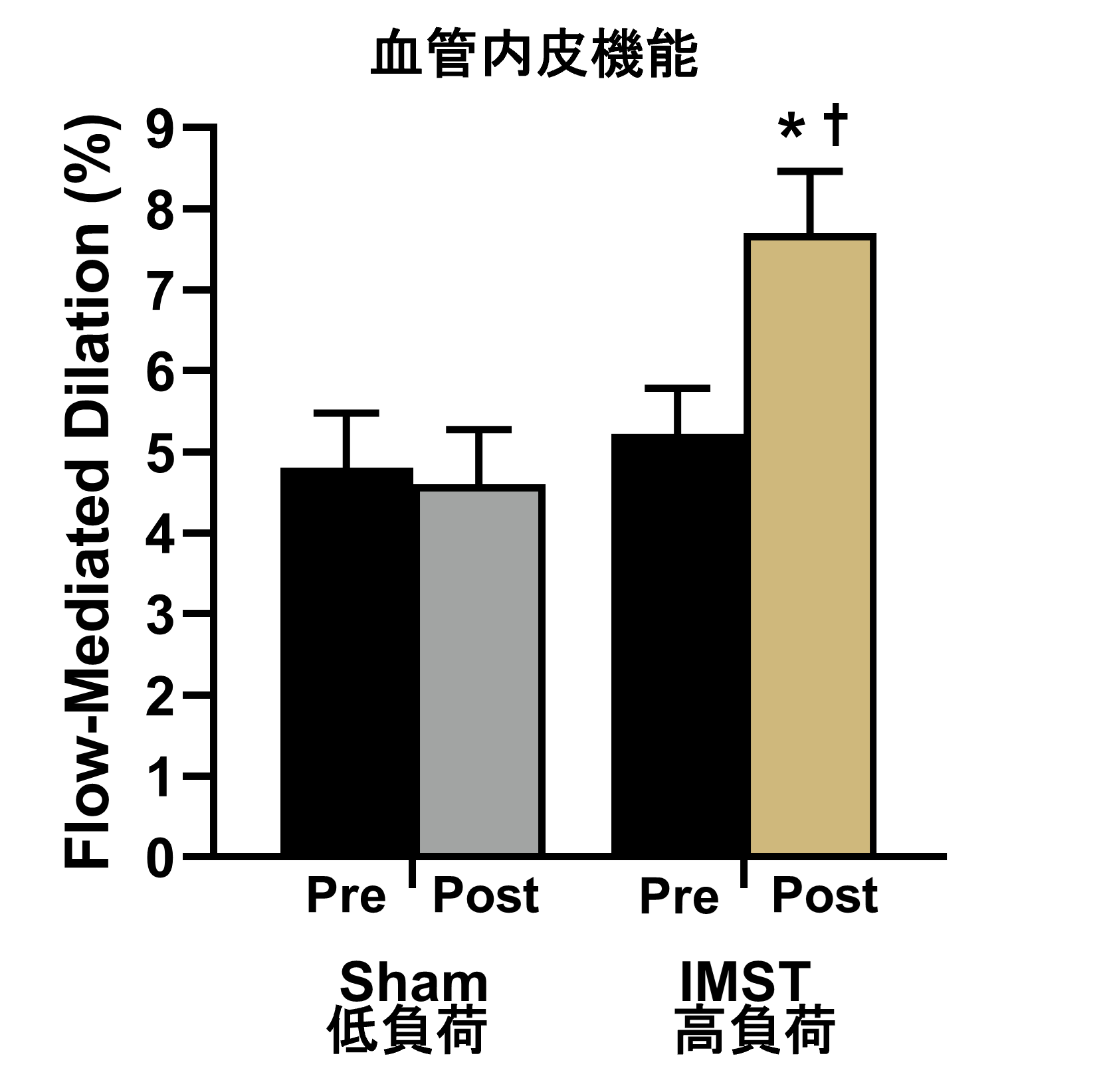 高負荷グループでは、血管内皮機能(上腕動脈の血流依存症血管拡張反応)が45%改善しました。