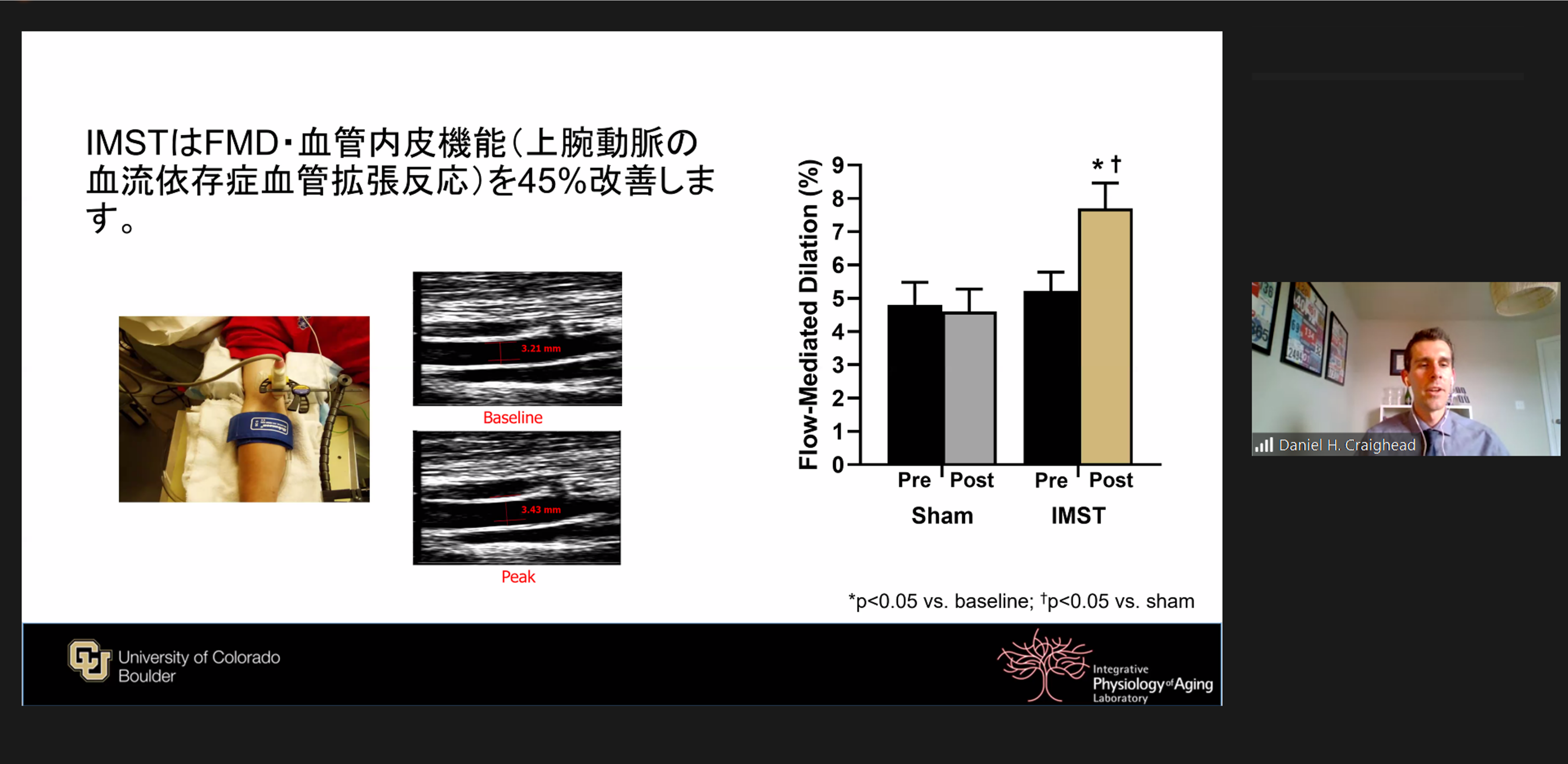 「吸気筋トレーニングによる循環器機能の改善の可能性」をテーマにアメリカ・コロラド大学ボルダー校(University of Colorado at Boulder)に所属する生理学者ダニエル・クレイグヘッド氏を講師にお迎えし、日本では主要な死因となっている脳血管疾患や虚血性心疾患などの循環器疾患を、吸気筋トレーニングにより機能改善させる可能性について、臨床試験の結果をもとに解説しました。