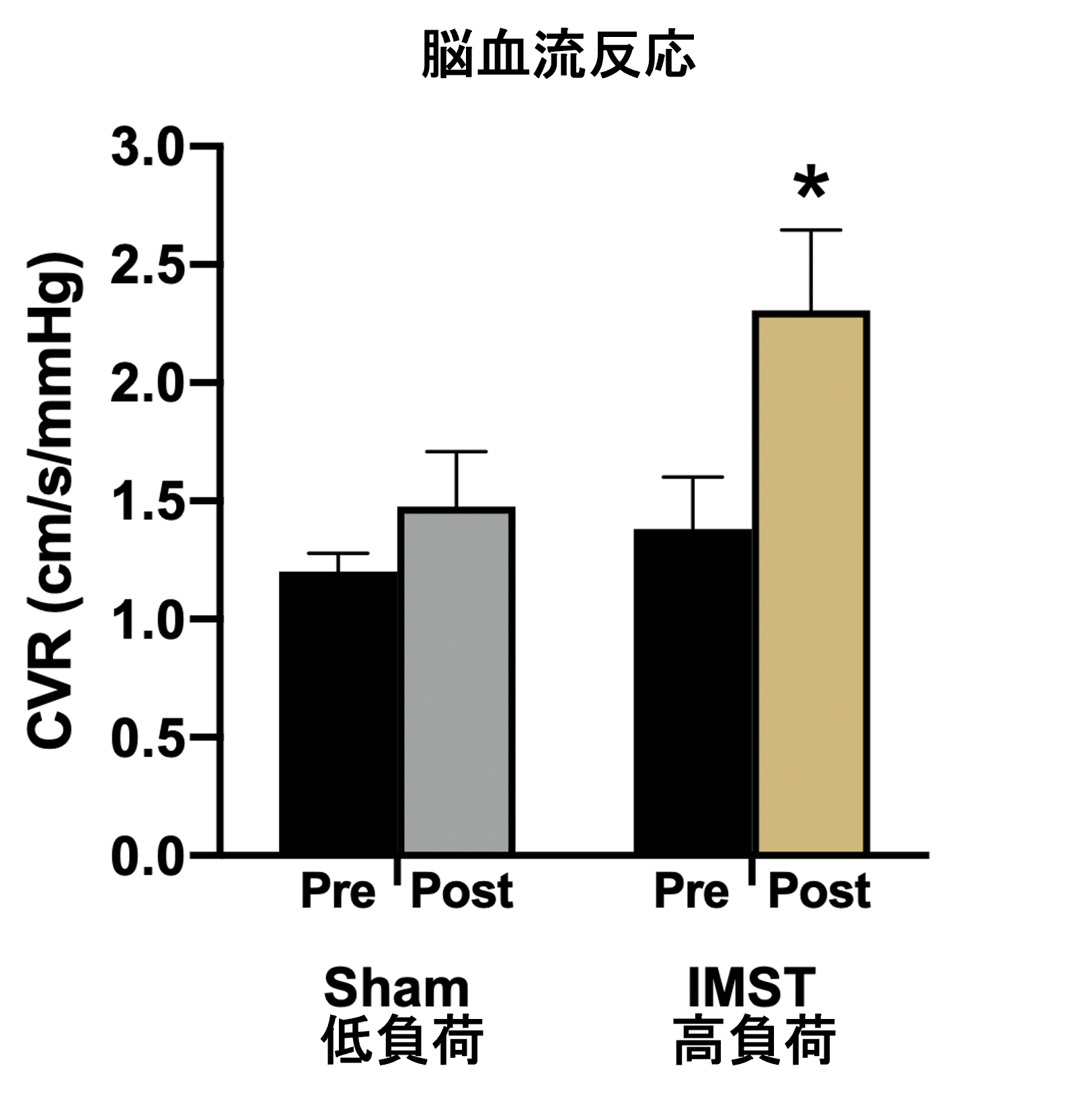 IMSTにおける循環機能の向上は、脳血管系にまで及ぶかを確認するため、5%の二酸化炭素吸入時に脳血流反応を比較し、検証。高負荷グループでは、脳血管系の健康改善が確認されました。
