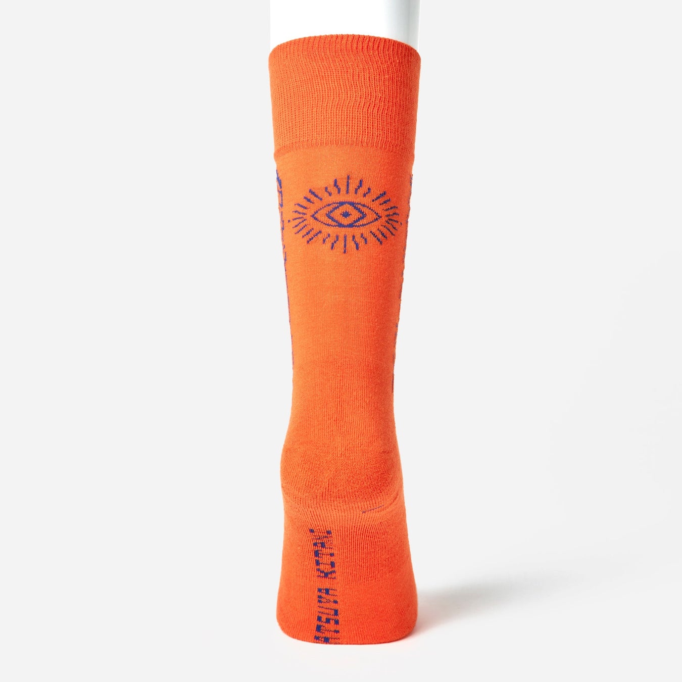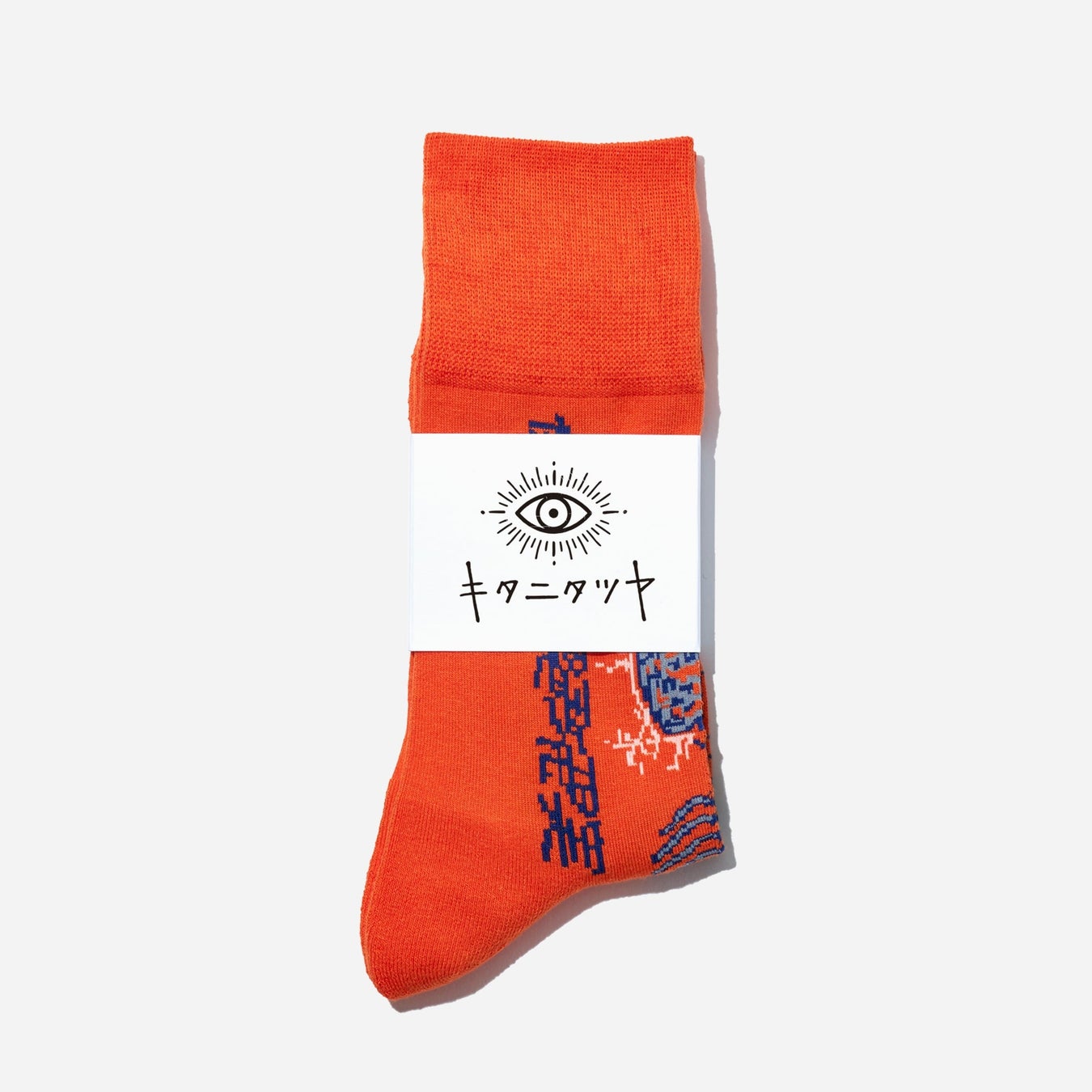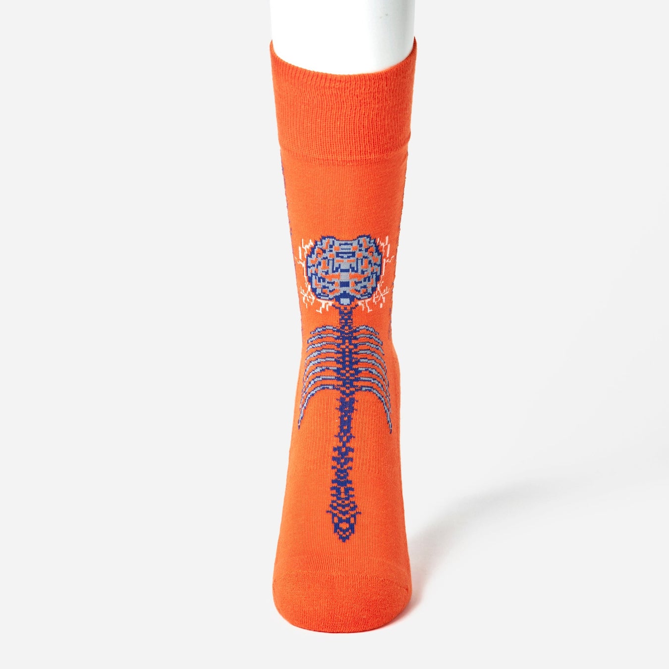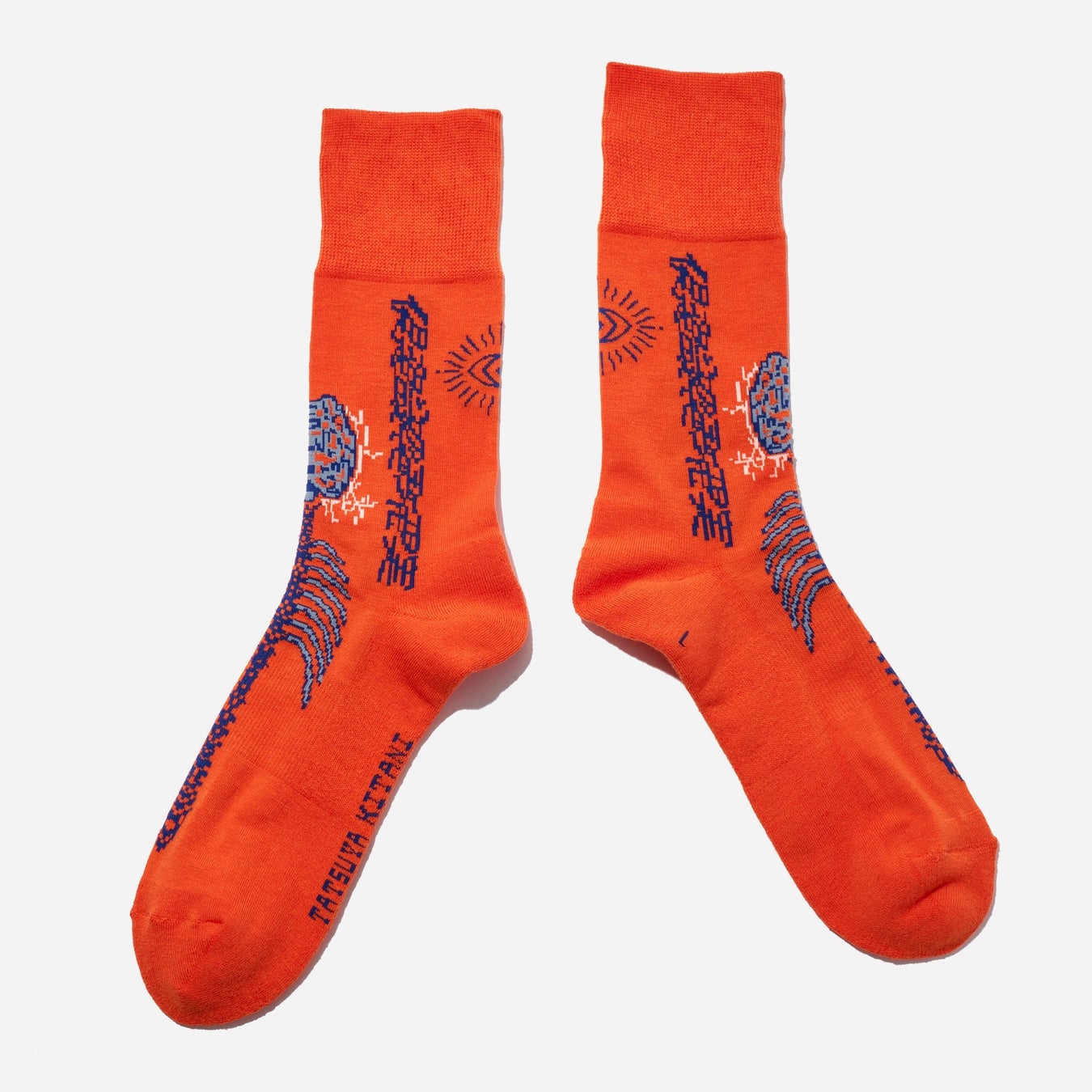 今回の靴下は、キタニタツヤのLIVEグッズにはない『CLUB UNREALITY』の世界観をKUDANが拡張し、キタ二氏のアイデアで脳と脊髄を爪先にかけて配置。背後には目のモチーフ、サイドにはLIVEグッズにも使われている「倶楽部非現実」のロゴを施した。