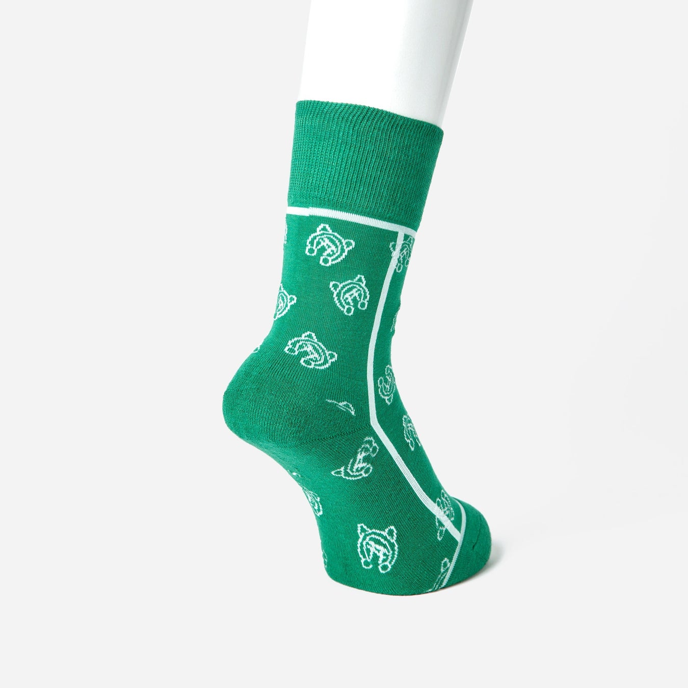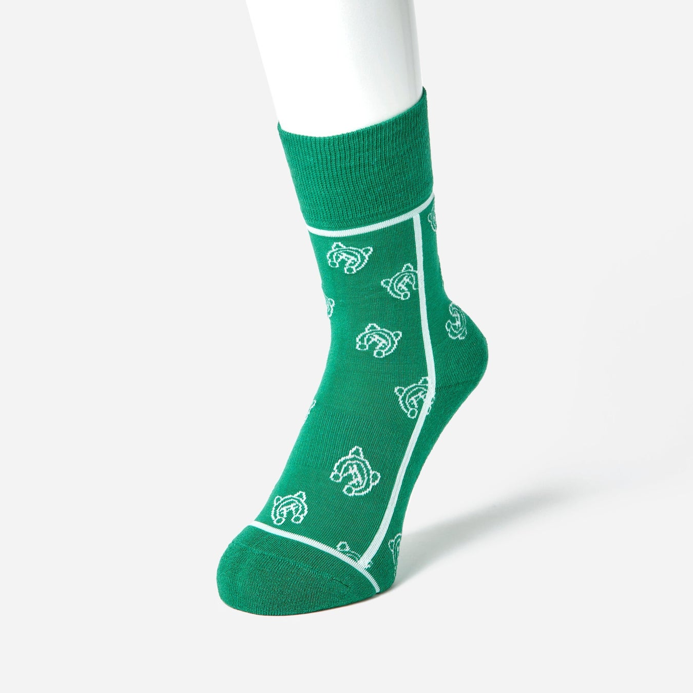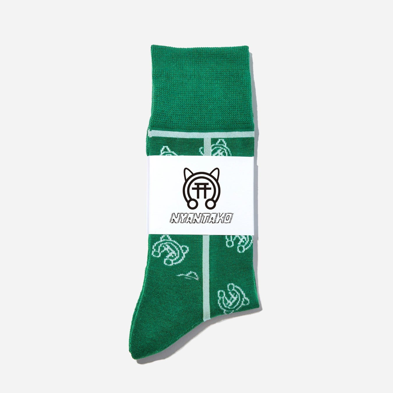 CHICSTOCKSの「ライン」をベースに、KUDANがデザインした「セプタムに猫耳+鳥居」というお互いを象徴するシンボルロゴを総柄で落とし込んだ。