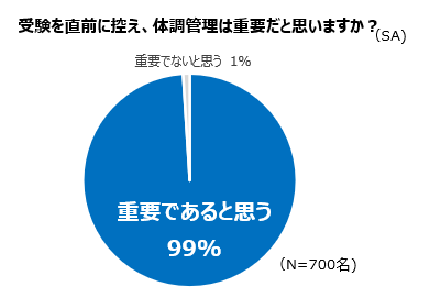 - 受験を直前に控え、今不安・心配なこと…勉強量に次いで、「風邪・病気にならないか心配」「日々の体調管理」99%が、受験直前を控え、体調管理は重要だと思うと回答