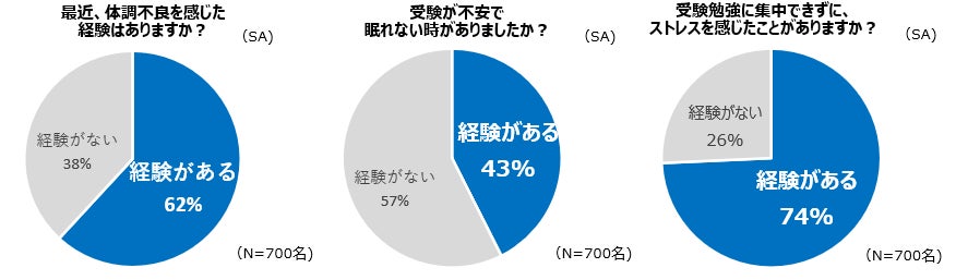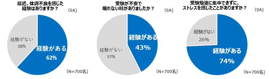 - 受験直前期に…「最近、体調不良を感じた経験がある」62%、「受験が不安で眠れない時がある」43%、「勉強が集中できずストレスを感じることがある」74% という結果に