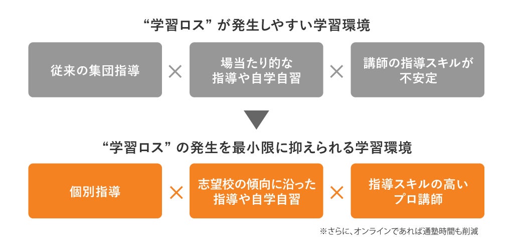「講師が全員に対して解説し、生徒が板書を写しながら聞く」という従来の集団授業のスタイルでは、その形式上、どうしても指導者が生徒全員を個別にフォローすることは難しいのが実情です。「板書を写すことに必死で内容の理解が疎かになってしまう」「すでに理解している内容も講義を聞かなければならず退屈に感じてしまう」などの "学習ロス" が発生しやすい環境にあります。