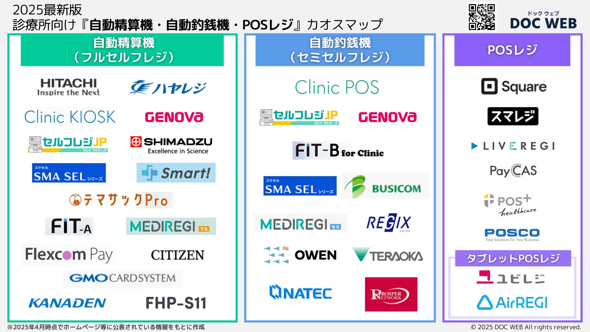 そこでDOCWEBでは、クリニックの運営スタイルに応じた機器選定の支援を目的として、セルフレジ・POSレジ市場に参入しているメーカーを網羅的に整理した「自動精算機・自動釣銭機・POSレジ カオスマップ2025年版」を独自に作成しました。