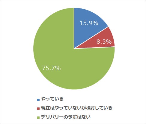 同様にデリバリーについて尋ねたところ(Q3,Q4)、実施している飲食店は15.9%にとどまり、実施しない理由としては「お店の業種業態に適していない(48.8%)」が最も多く、次いで、「人手不足(42.6%)」、「期待できる売り上げが小さい(28.7%)」と続いた。