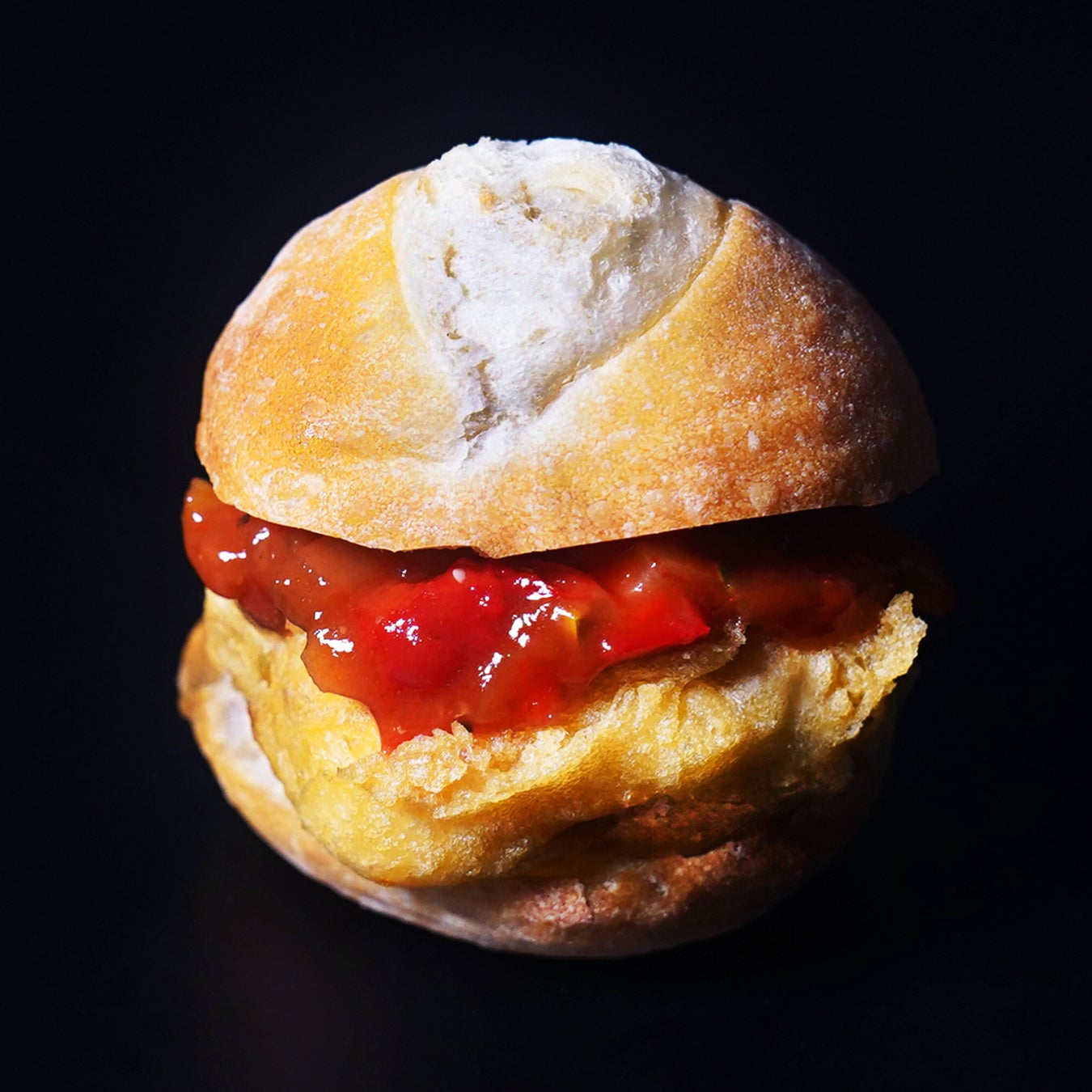 お子様でも食べやすいサイズの米粉バンズに「親鳥」を使った無添加のチキンナゲットを挟んだ、ジューシーなチキンバーガーです。ほどよい食感の野菜がゴロゴロ入ったマイルドなトマトソースをトッピングし、鶏肉の旨味をしっかり味わえるとともに野菜も摂ることができます。
