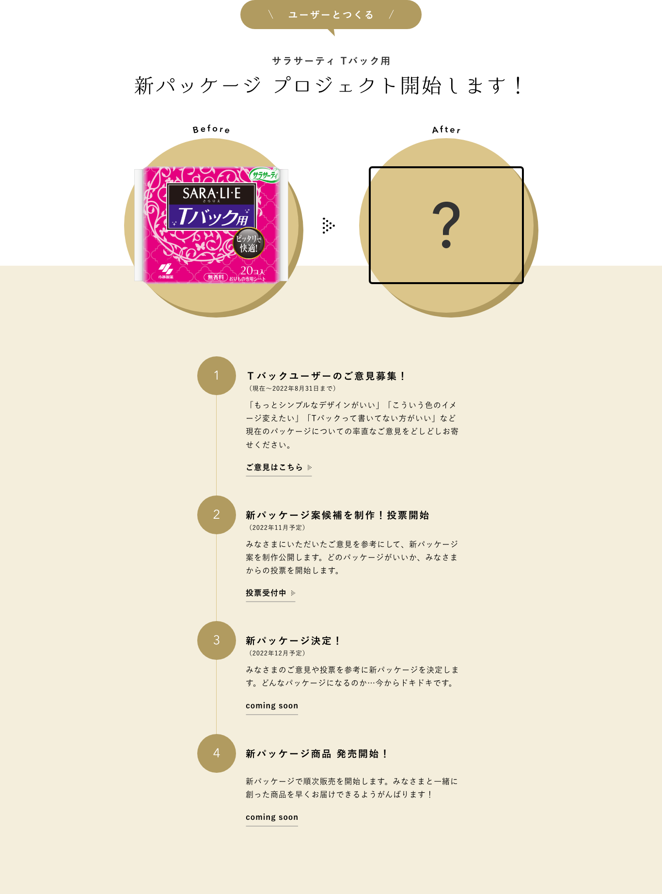 同プロジェクトでは、TバックユーザーのみなさまのTバック着用時のお悩みを集めながら新しい「Tライナー」を提案していきます。まずは第一弾として、みなさまの声をもとにTバック専用おりものシートの新パッケージを作り、全国発売いたします。