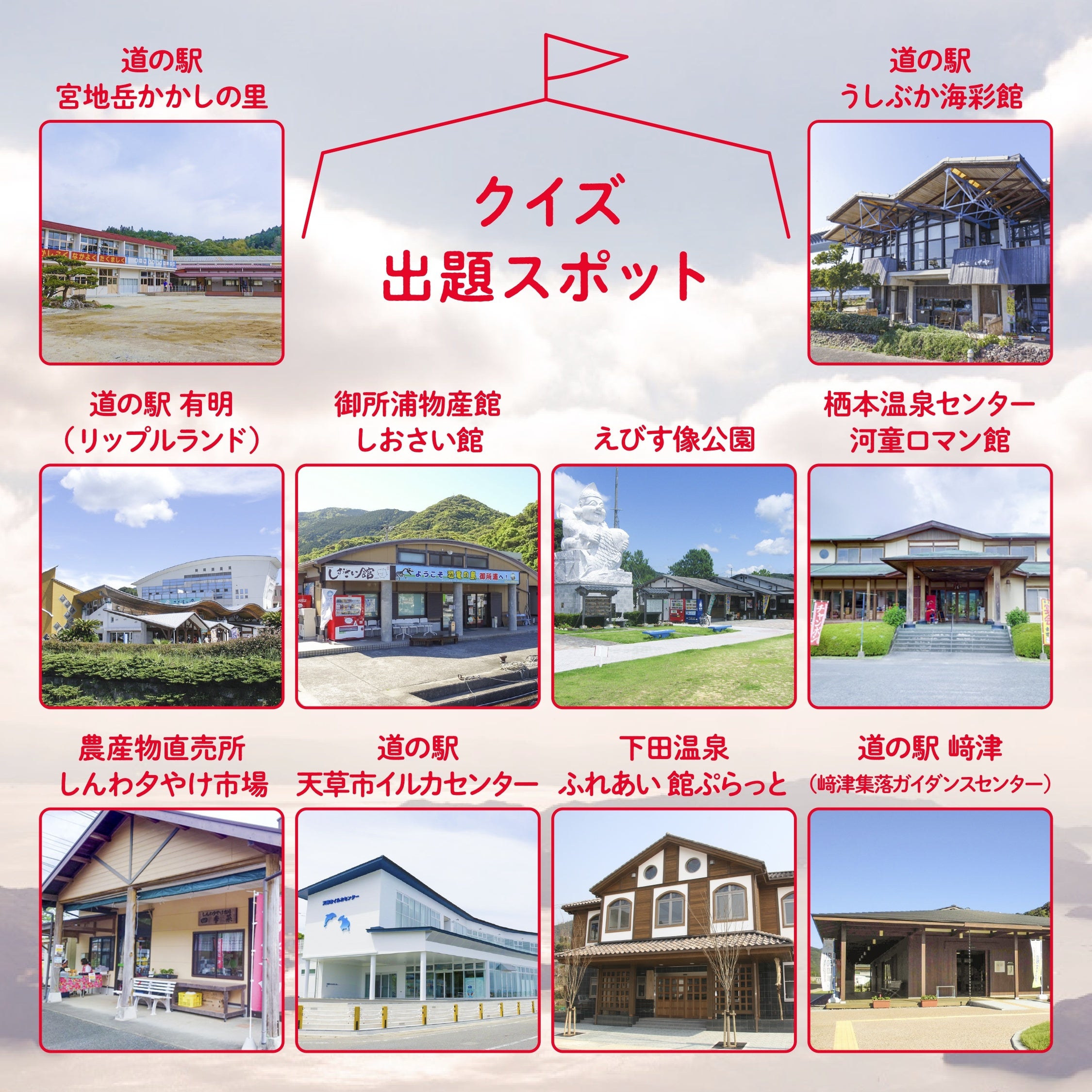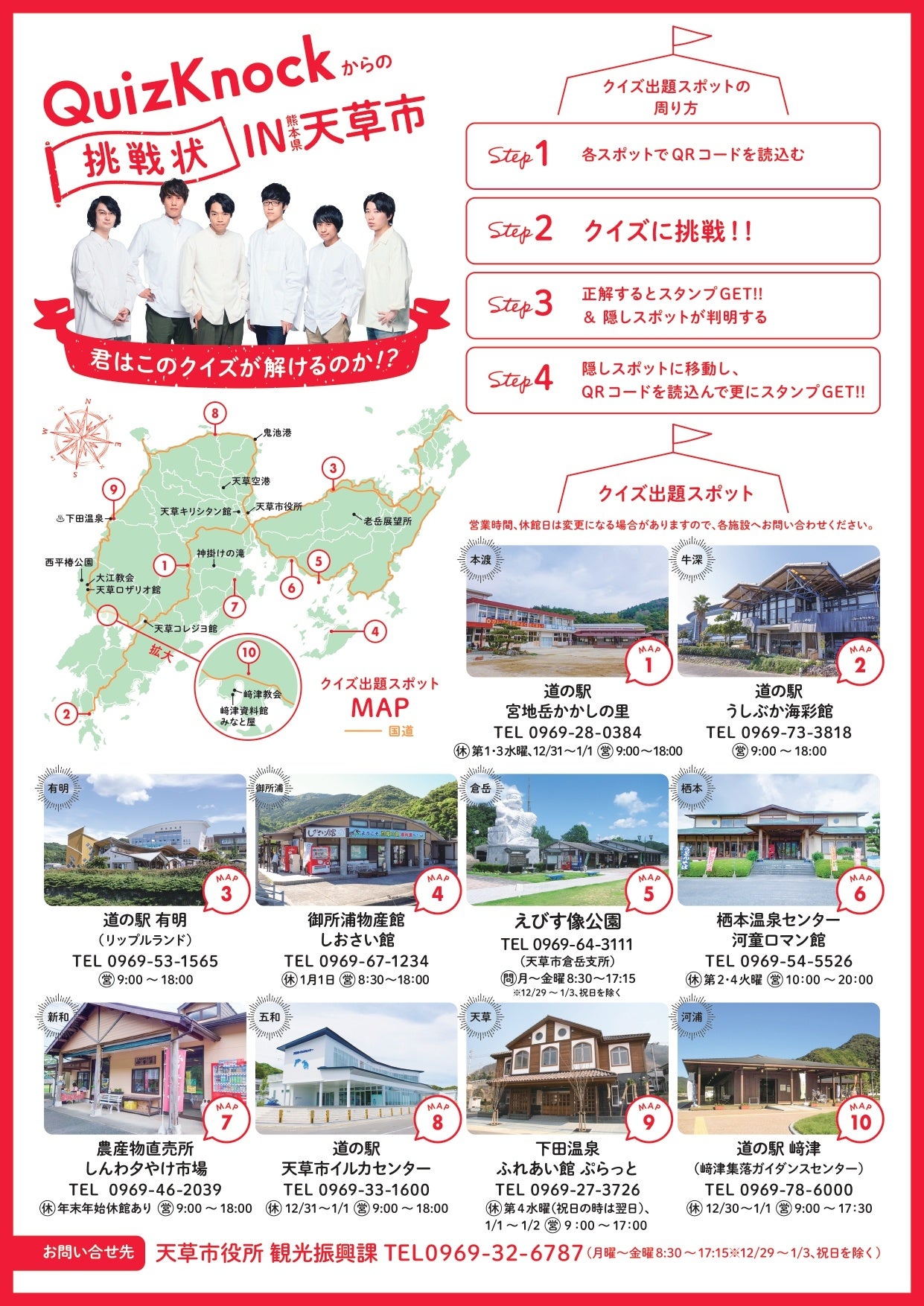 市内10地域(本渡、牛深、有明、御所浦、倉岳、栖本、新和、五和、天草、河浦)の観光施設等に設置されたQRコードから発出されるクイズを解くと、追加で市内の隠しスポット10か所が分かり、ボーナススタンプもGETできます。
