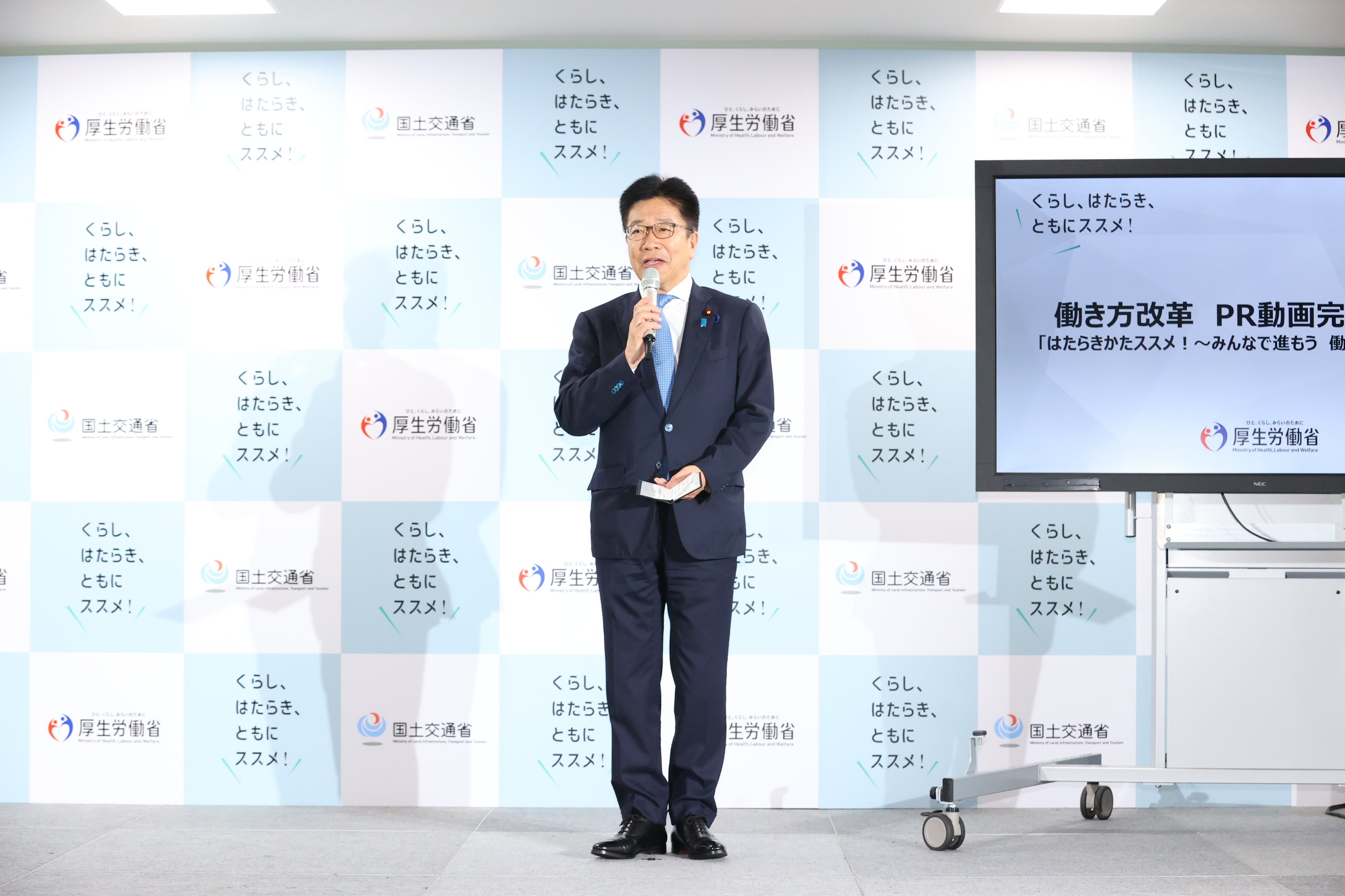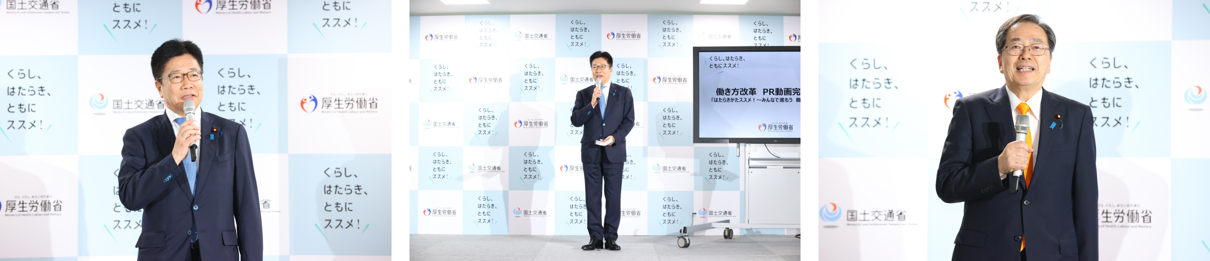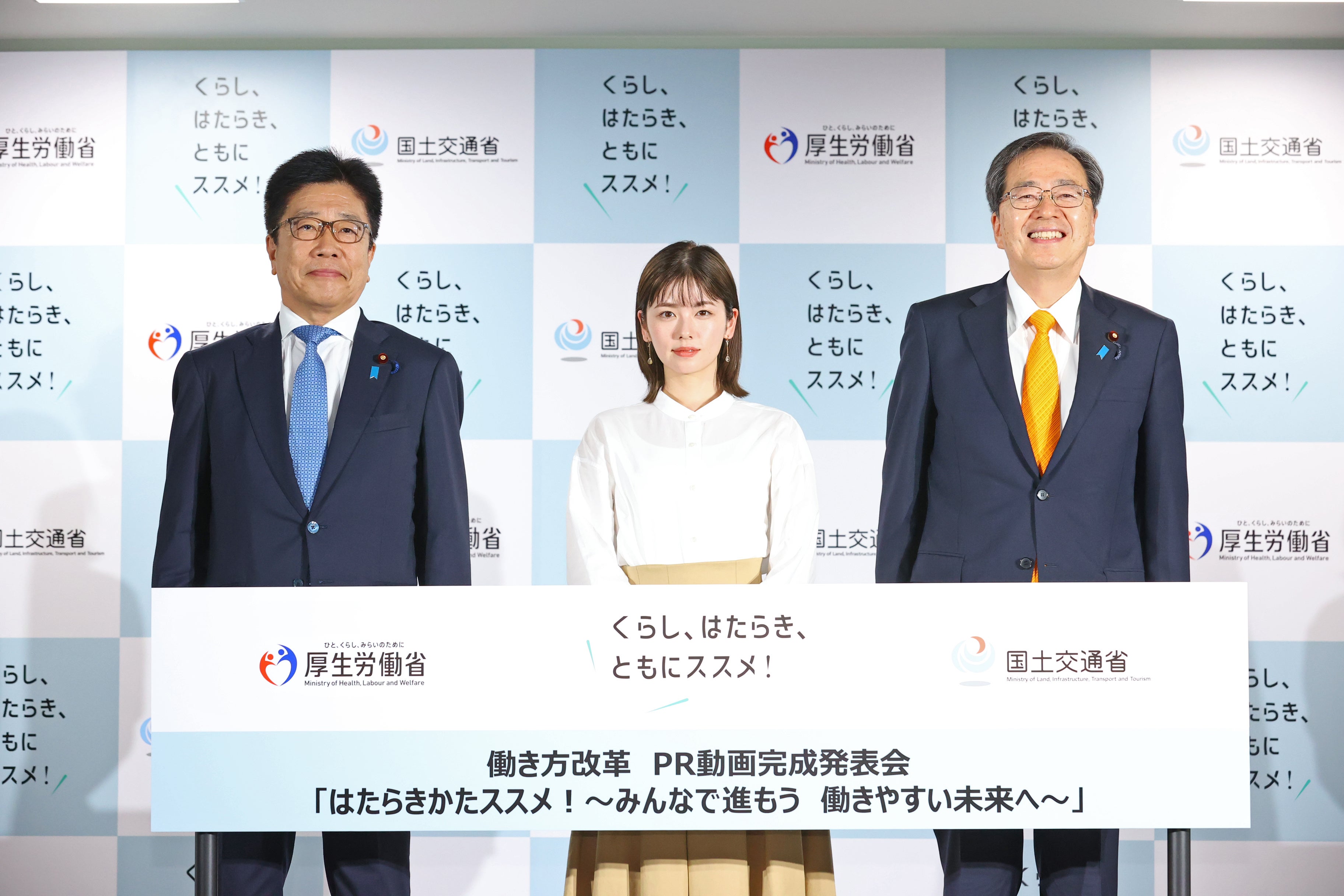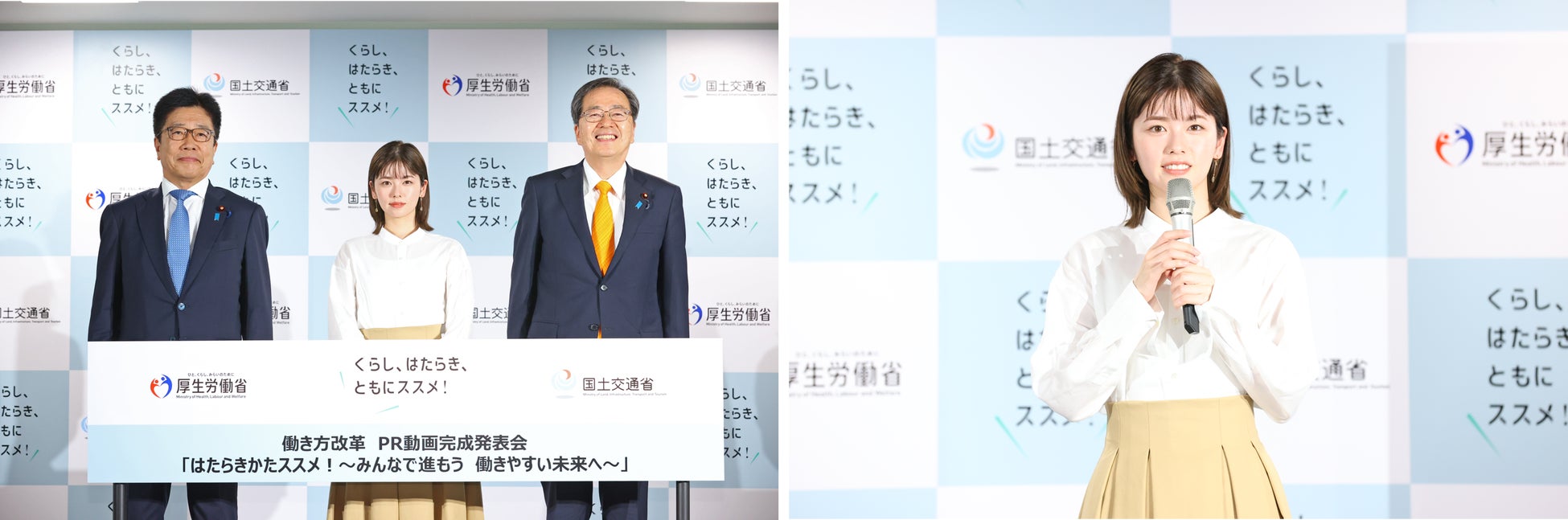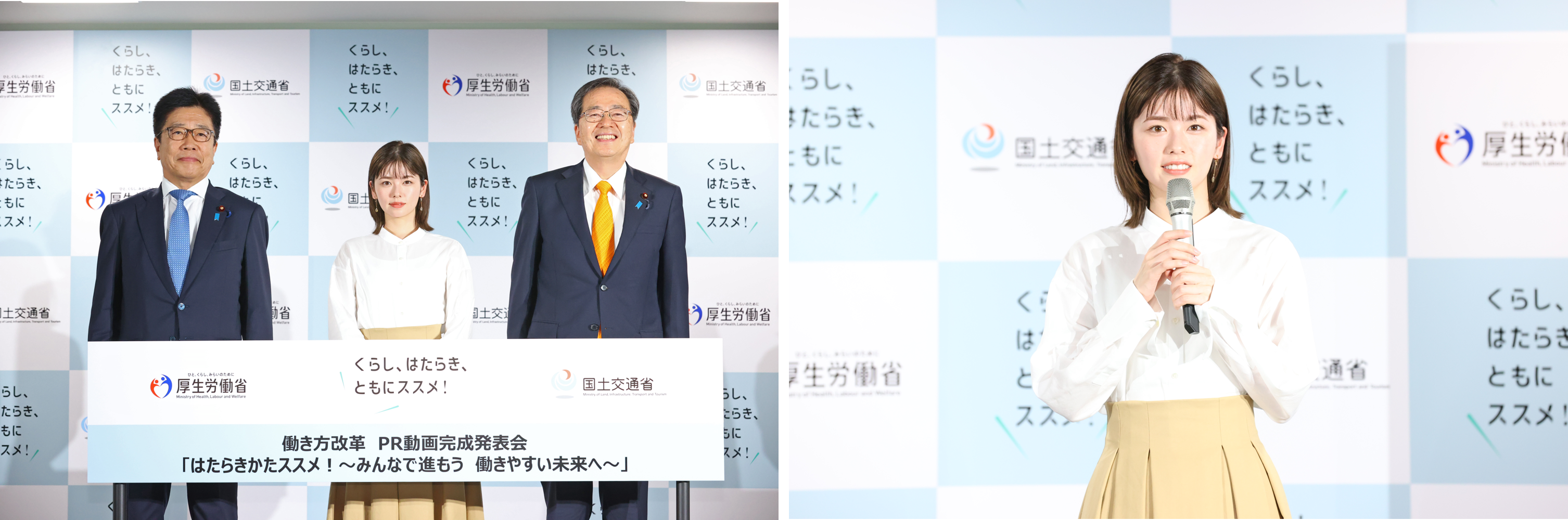 厚生労働省、国土交通省では、建設業、運輸業が抱える課題や、国民の皆さまにご協力いただきたいことを広く伝えるためのPR動画「はたらきかたススメ」を制作し、本日、シリーズ第一弾の完成発表会を厚生労働省で開催しました。