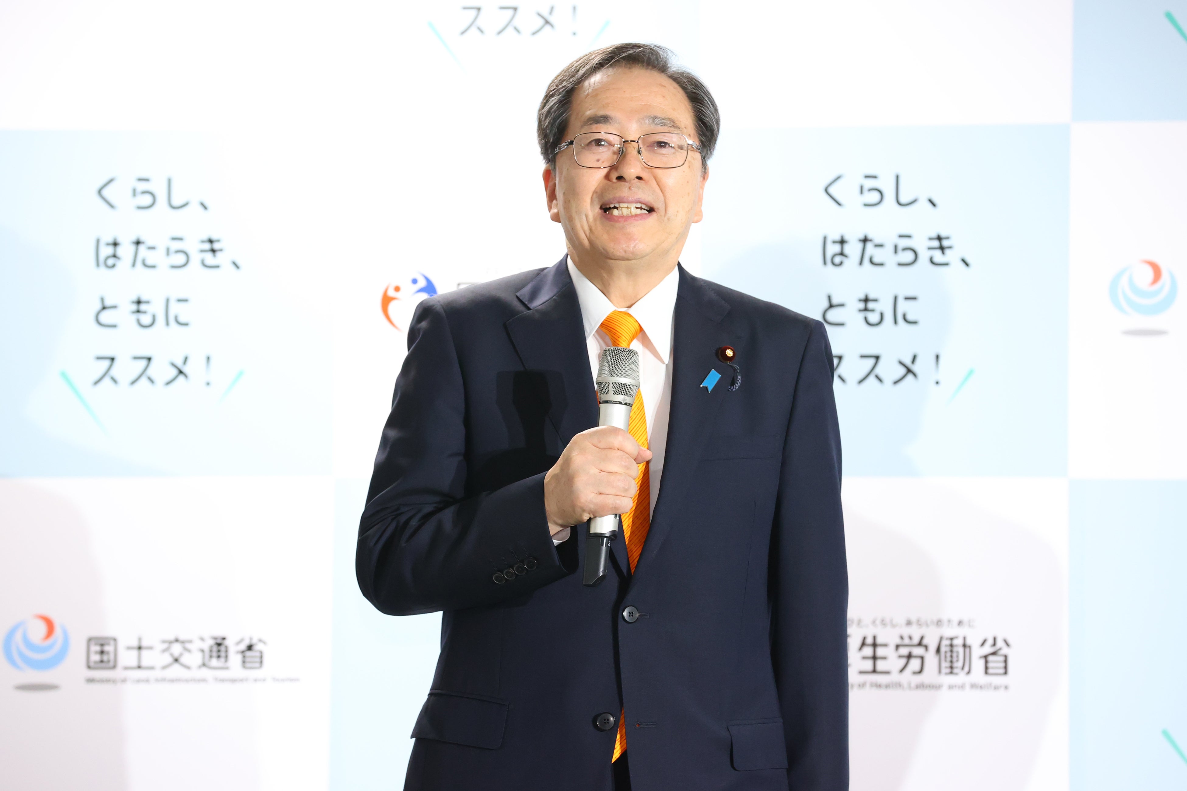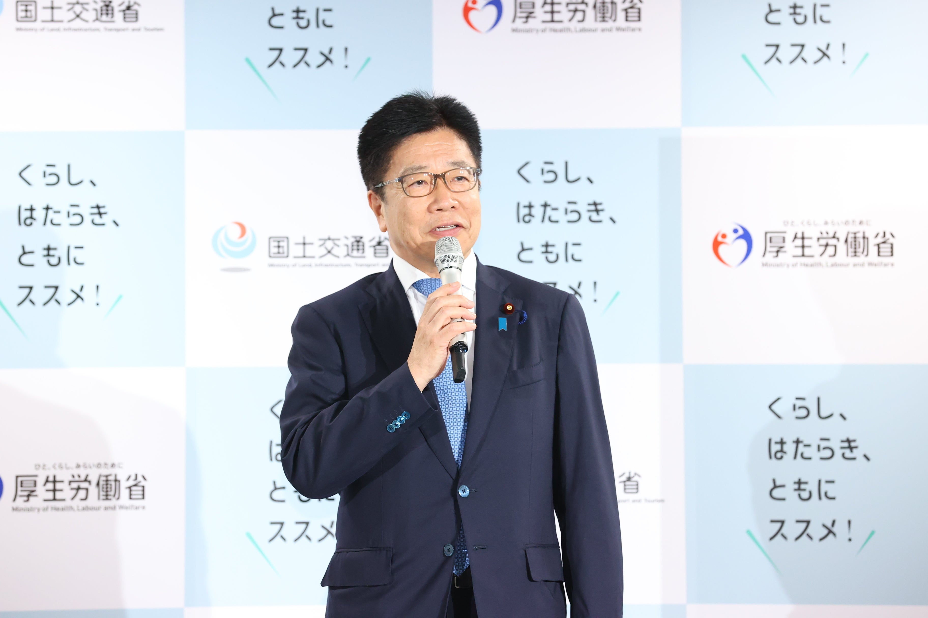 加藤大臣からはご挨拶をいただき、「運送業・建設業で働く方々は社会のインフラ、物流を支えるなくてはならない存在。一方で、労働時間が長い背景には、取引慣行上の問題がある。長時間労働の改善には国民の皆さま方のご協力が必要であり、こうした方々が健康に働き続けられる、働きやすい未来に向かって、皆さまと取り組みを進めていきます」とお話しいただきました。