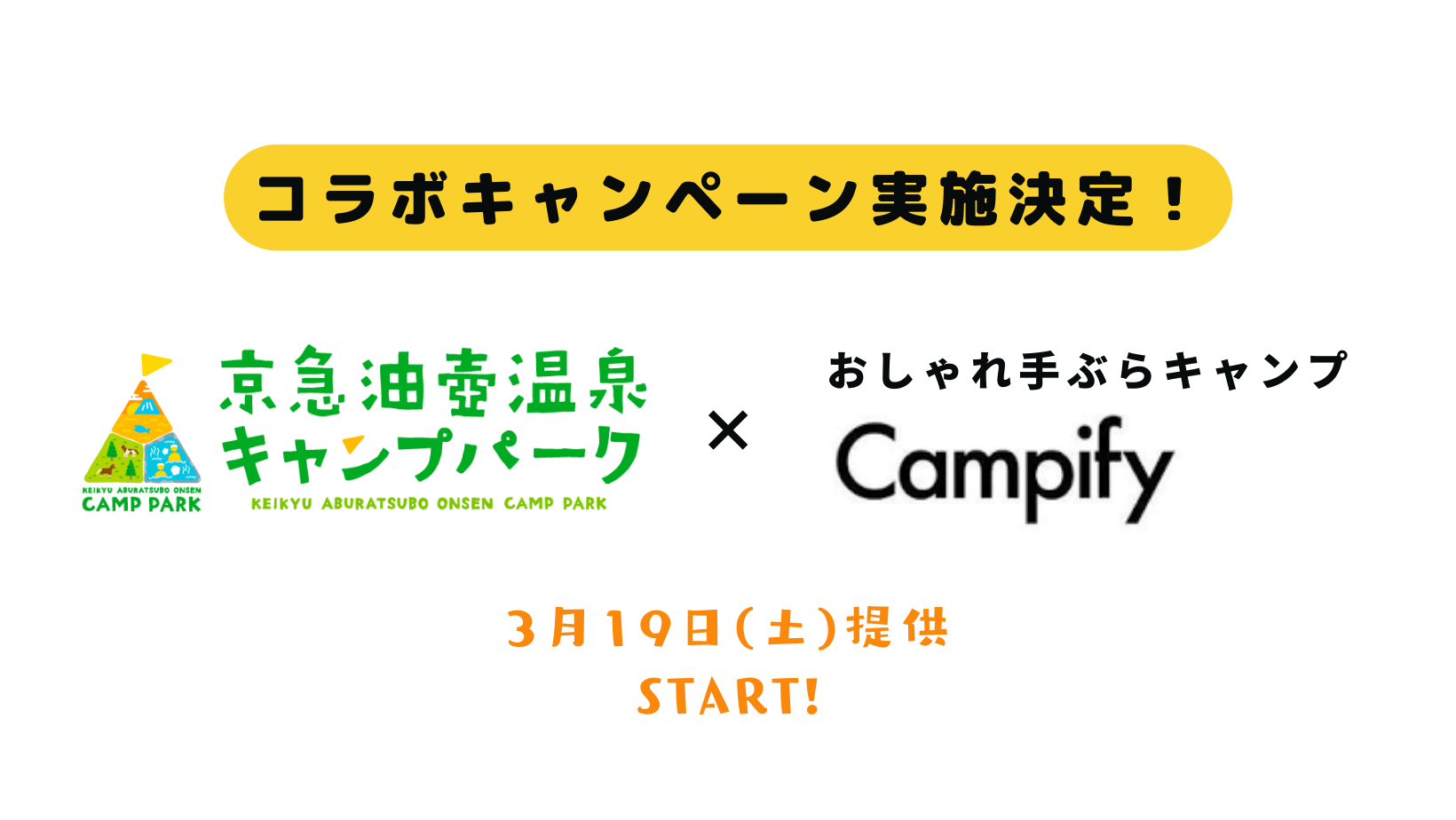 手ぶらキャンプ事業Campifyを運営するFLY株式会社(本社:東京都渋谷区、代表取締役:木村隆司)は、京急グループの三崎観光株式会社(本社:神奈川県三浦市、社長:濱田 真行、以下 三崎観光)と提携し、三崎観光が運営する京急油壺温泉キャンプパーク内に手ぶらキャンプサービス「Campify(キャンピファイ)」の提供を始めます。