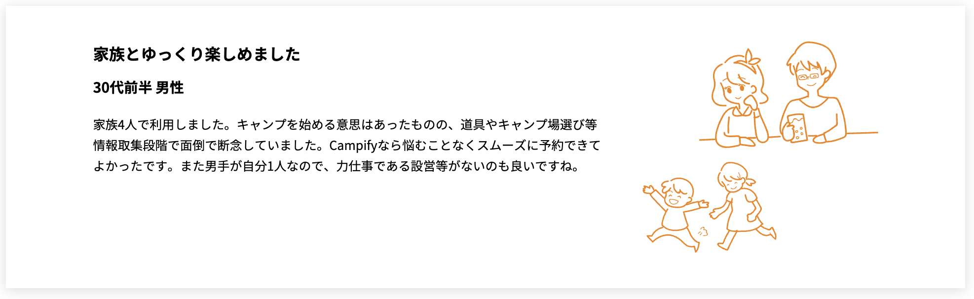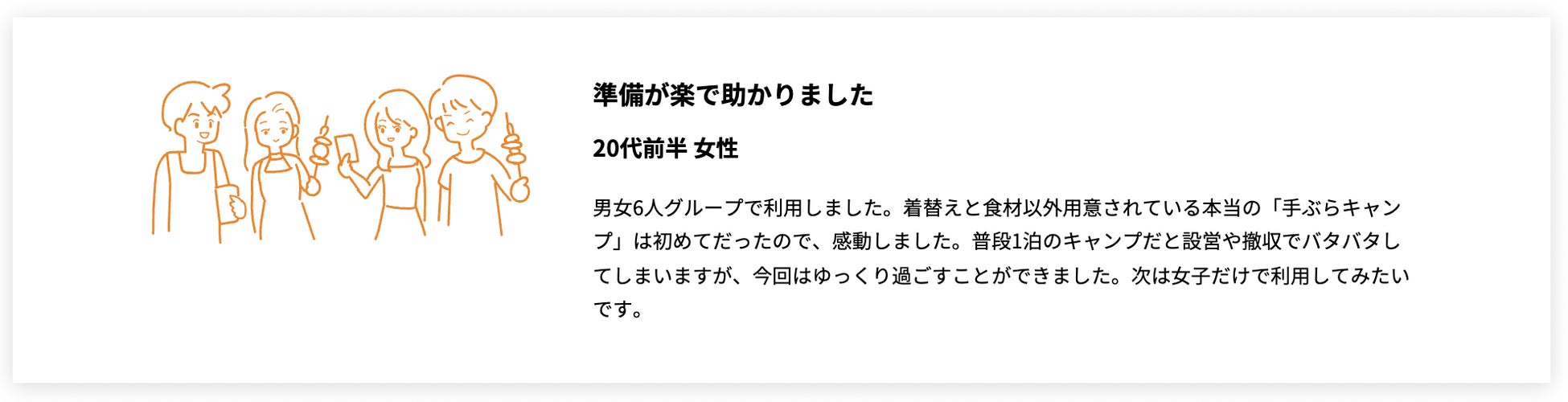 キャンプ道具の用意から、設営・片付けまで弊社にお任せ頂ける本サービスをご利用いただくことで、キャンプ場のオーナー様は運用コストゼロで「手ぶらキャンププラン」を新設していただくことが可能になり、お客様ももっと気軽にキャンプ場をご利用いただくことができ高収益化に繋げます。