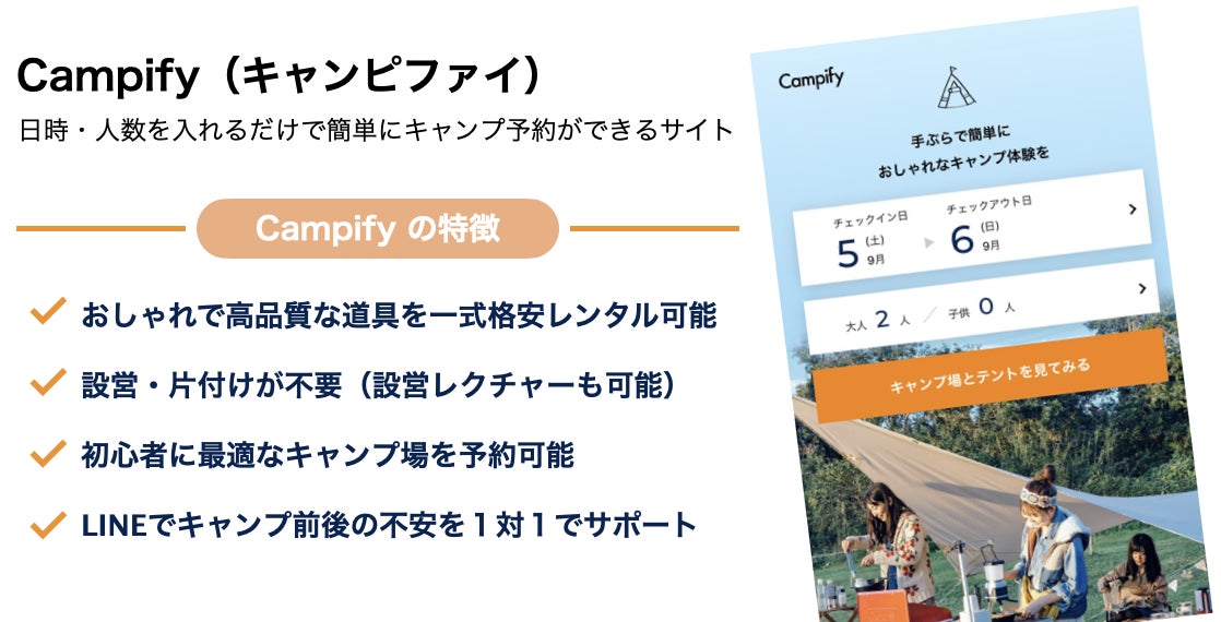 FLY株式会社は設営・撤収不要のおしゃれ手ぶらキャンプLINEで簡単に予約できるサービス「Campify(キャンピファイ)」の運営会社です。