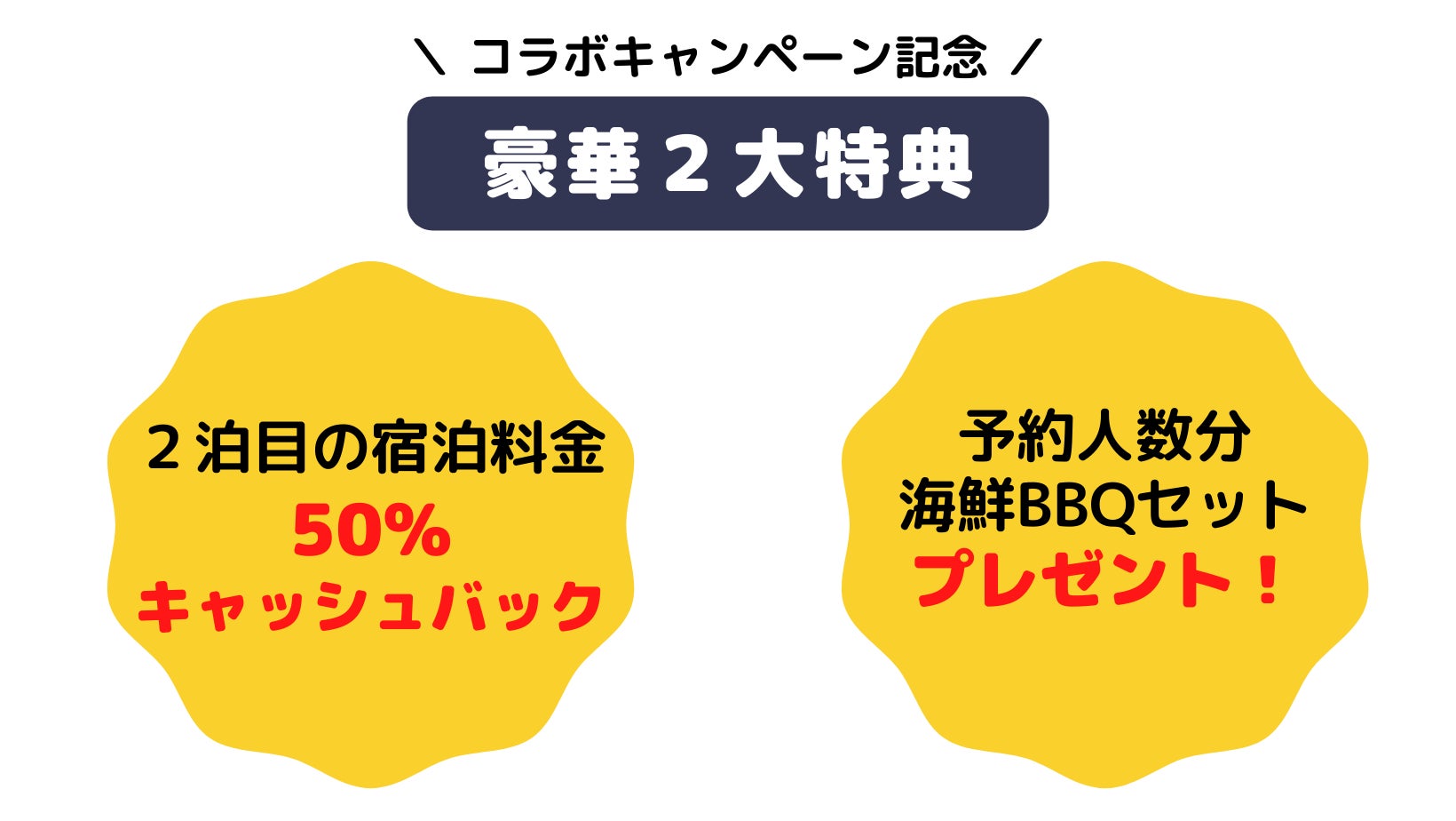 ① 2連泊のお客さまは2泊目料金の50%を現地にてキャッシュバック
