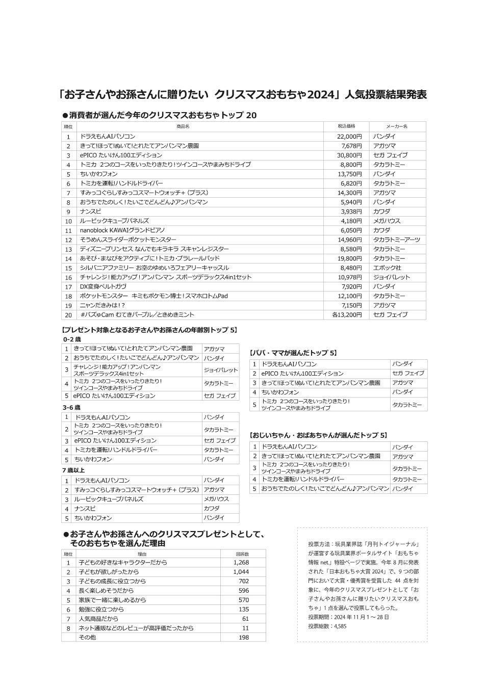同投票は、玩具業界誌「月刊トイジャーナル」が運営する玩具業界ポータルサイト「おもちゃ情報net.」特設ページで実施。投票期間は11月1日から28日までで、4585名の投票があった。