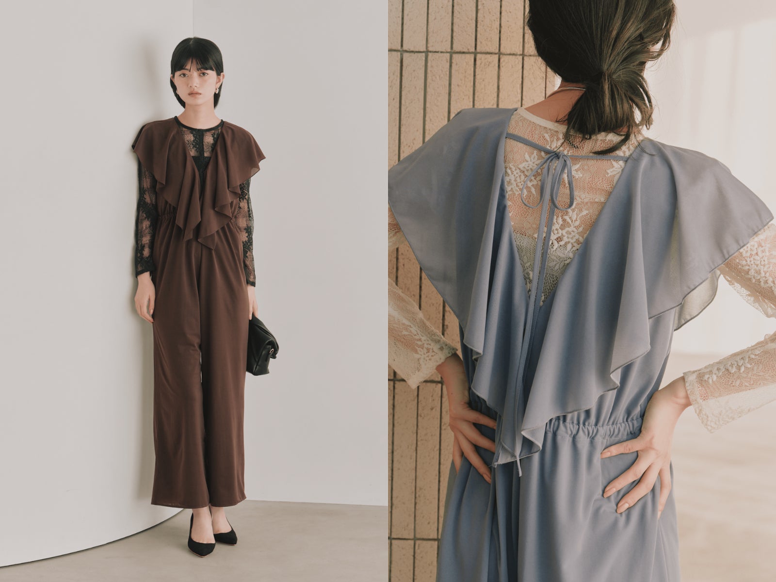 繊細なレースや素材使い、女性らしいシルエットにこだわりながら、結婚式やパーティー、セレモニーなどさまざまなフォーマルシーンに対応するアイテムを提案しています。