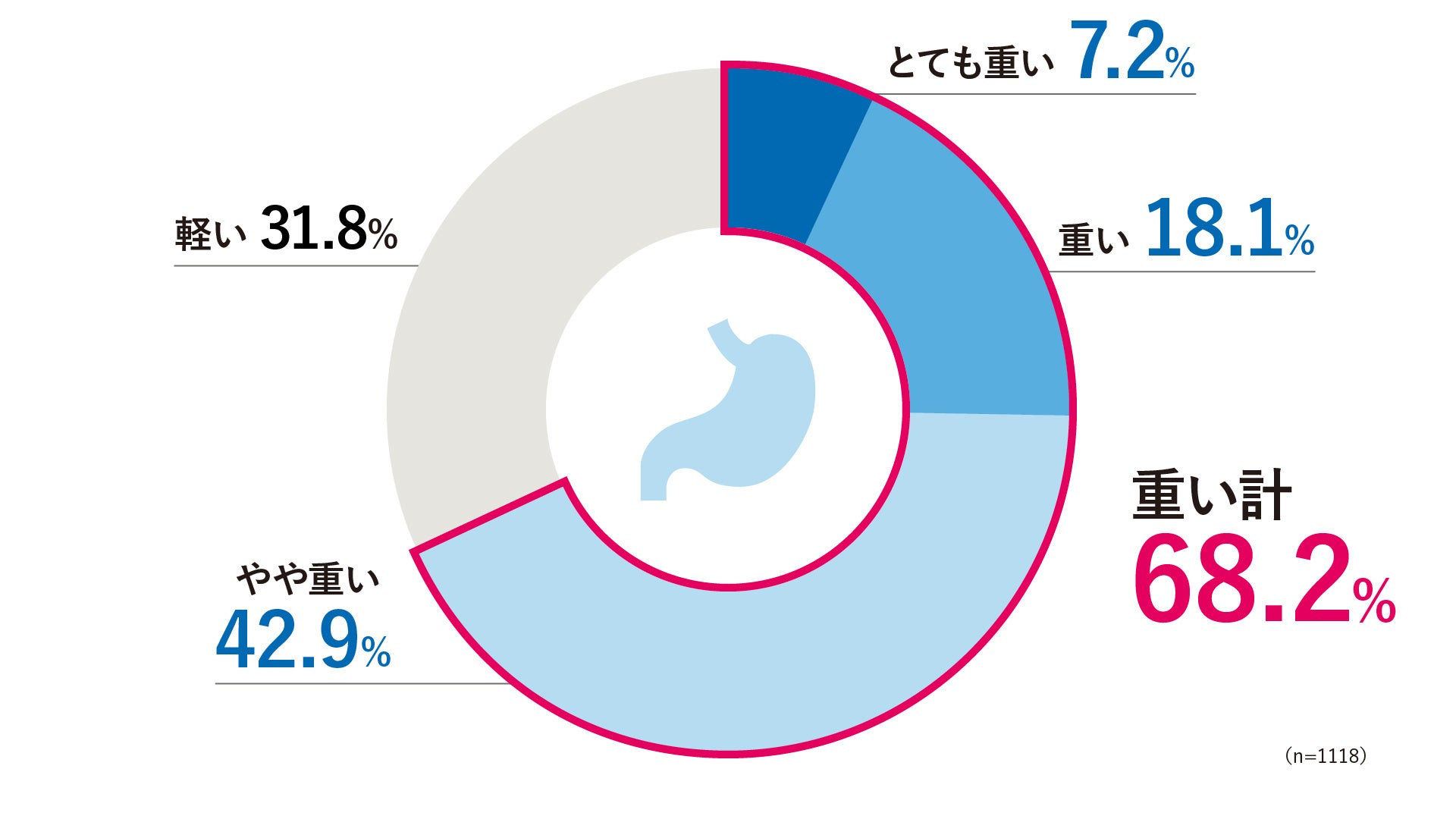 胃の不調を感じている人に、過去(コロナ禍)と比較して、どの程度胃の不調を感じているかを聞いたところ、「とても重い」7.2%、「重い」18.1%、「やや重い」42.9%と合計68.2%の人が「胃の不調が重くなった」と回答しました。「軽い」と答えた人は約3割にとどまり、アフターコロナとなった現在のほうが、胃の不調の程度が重くなっていることが示唆されました。